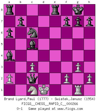 Last move : 0-1 2021 July 13 12:29:47 [Event "FICGS__CHESS__RAPID_C__000266"] [Site "FICGS"] [Date "2021.07.05"] [Round "1"] [White "Brand Lyard,Paul"] [Black "Swiatek,Janusz"] [Result "0-1"] [WhiteElo "1777"] [BlackElo "1954"] 1.e4 e6 2.e5 c5 3.c4 Nc6 4.Nc3 Nxe5 5.Nb5 a6 6.Nc3 Ne7 7.d4 cxd4 8.Qxd4 N7c6 9.Qe4 Bb4 10.Bf4 d5 11.cxd5 exd5 12.Qe3 d4 13.Qd2 Qe7 14.Bxe5 dxc3 15.bxc3 Qxe5+ 16.Ne2 O-O 17.Rb1 Bc5 18.g3 Qe4 19.Rg1 Qxb1+ 20.Nc1 Re8+ 21.Kd1 Bg4+ 22.Be2 Bxe2+ 23.Ke1 Bb5 24.Kd1 Ba4+ 25.Qc2 Qxc2+ 0-1 French : Steinitz attack Kingside Castling by player Black (move 16) Player Black won this chess game. Follow this game move after move (download)When you don't know what to do, wait for your opponent to get an idea - it's sure to be wrong. (Tarrasch) Rauchen ist dem Schachspieler bei seiner Arbeit, also im Wettkampf, untersagt. (Viktor Kortschnoi) La última cosa en que Fischer estaba interesado era en tonterías, siempre y cuando el Ajedrez estuviera involucrado. (Elie Agur) Si rien de grave n'est détecté lors de l'analyse d'une position, on joue alors le coup. Seconde règle de Blumenfeld. If you work for a living, why do you kill yourself working ? (Tuco to a chicken in The Good, The Bad and The Ugly)