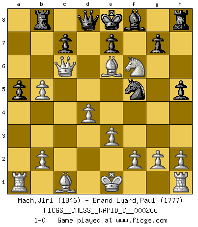 Last move : 1-0 2021 August 19 21:51:6 [Event "FICGS__CHESS__RAPID_C__000266"] [Site "FICGS"] [Date "2021.07.05"] [Round "1"] [White "Mach,Jiri"] [Black "Brand Lyard,Paul"] [Result "1-0"] [WhiteElo "1846"] [BlackElo "1777"] 1.d4 d5 2.c4 dxc4 3.Nf3 b5 4.e3 Bg4 5.a4 Bxf3 6.Qxf3 Nd7 7.axb5 Qb8 8.Bxc4 f6 9.Qc6 a5 10.Be6 Qd8 11.Nc3 Nh6 12.Ne4 Nf5 13.Nc5 Rb8 14.Nxd7 h5 15.Nxf6+ 1-0 QGA : Ericson variation Player White won this chess game. Follow this game move after move (download)The chessboard is the world, the pieces are the phenomena of the Universe, the rules of the game are what we call the laws of Nature and the player on the other side is hidden from us. (Thomas Huxley) Wenn Dein Gegner dir ein Remis anbietet, versuch herauszufinden, weshalb er glaubt schlechter zu stehen. (Nigel Short) Un mal día en el Ajedrez, es mejor que cualquier buen día en el trabajo. (Anonymous) Le joueur d'Echecs qui veut atteindre le top est obligé de développer son propre credo créatif. Alexeï Stepanovicth Souétine. Il est facile d'écrire des livres ! Ce qui est difficile, c'est de jouer ! (Alexeï Stepanovicth Souétine) Who needs drugs and alcohol if he can play Big Chess at FICGS ? (Heinz-Georg Lehnhoff)