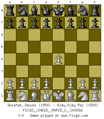 Last move : 1-0 2021 August 5 23:15:20 [Event "FICGS__CHESS__RAPID_C__000266"] [Site "FICGS"] [Date "2021.07.05"] [Round "1"] [White "Swiatek,Janusz"] [Black "Ajay,Ajay Rai"] [Result "1-0"] [WhiteElo "1954"] [BlackElo "1500"] 1.e4 1-0 This chess game has been lost on time (started : 2021.07.05 20:25:52) King's pawn Opening Player White won this chess game. Follow this game move after move (download)Weak points or holes in the opponent's position must be occupied by pieces not Pawns. (Siegbert Tarrasch) Schach ist Kampf, hauptsächlich jedoch gegen die eigenen Fehler. (Savielly Grigorievitsch Tartakower) Con el fin de mejorar tu juego, debes de estudiar los finales antes que todo, ya que mientras que los finales pueden ser estudiados y dominados por sí mismos, el juegomedio y la apertura deben de ser estudiados en relación con los finales. (José Raúl Capablanca) Les erreurs sont comme les malheurs, elles n'arrivent jamais seules. (Siegbert Tarrasch) Optimism is a variety of information deficit. Sometimes especially true for correspondence chess games. (Michael Aigner)
