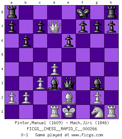 Last move : 0-1 2021 August 26 5:47:41 [Event "FICGS__CHESS__RAPID_C__000266"] [Site "FICGS"] [Date "2021.07.05"] [Round "1"] [White "Pintor,Manuel"] [Black "Mach,Jiri"] [Result "0-1"] [WhiteElo "1609"] [BlackElo "1846"] 1.e4 d5 2.exd5 Qxd5 3.Nc3 Qa5 4.f4 Nf6 5.d4 Bf5 6.Bd2 e6 7.Nf3 Qb6 8.Na4 Qd6 9.Nc5 b6 10.Na6 Be7 11.Bb4 Qxf4 12.Nxb8 Qe3+ 13.Be2 Bxb4+ 14.c3 Bd6 15.Qa4+ Kf8 16.Nd7+ Nxd7 17.Qxd7 Bd3 18.Ng1 Bxh2 19.Rd1 Bg3+ 0-1 Scandinavian (centre counter) defense Player Black won this chess game. Follow this game move after move (download)I am the best player in the world and I am here to prove it. (Bobby Fischer) Du weisst es gibt ein Problem mit Computern und Fernschach, wenn jeder eine Rating von 2450 hat. (John Christen Knudsen) Es muy difícil jugar en contra de la teoría de Einstein. - en su primera derrota en contra de Fischer (Mikhail Tal) Les réformistes prétendent que les progrès de la théorie conduiront à la disparition des échecs, et qu'il faut, pour leur rendre vie, en remanier les règles. En réalité, qu'exprime cette affirmation? Le mépris de l'intuition, de l'imagination et de tous les autres éléments qui font des échecs un art. (Alexander Alekhine) There is a great deal of difference between an eager man who wants to read a book and a tired man who wants a book to read. (G.K. Chesterton)