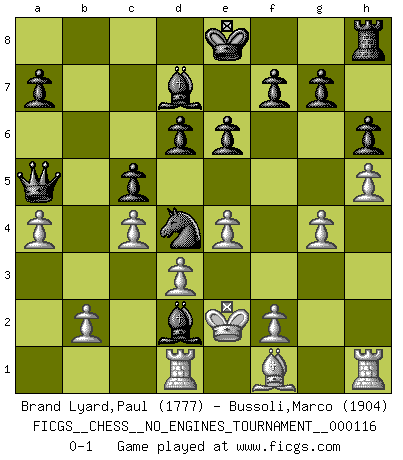 Last move : 0-1 2021 July 18 17:37:38 [Event "FICGS__CHESS__NO_ENGINES_TOURNAMENT__000116"] [Site "FICGS"] [Date "2021.07.06"] [Round "1"] [White "Brand Lyard,Paul"] [Black "Bussoli,Marco"] [Result "0-1"] [WhiteElo "1777"] [BlackElo "1904"] 1.e4 c5 2.c4 Nc6 3.Nc3 d6 4.d3 Nf6 5.Bg5 e6 6.Nf3 Be7 7.Bxf6 Bxf6 8.h4 Bd7 9.g4 h6 10.h5 Qb6 11.Qb3 Qa5 12.Qxb7 Rb8 13.Qxb8+ Nxb8 14.a4 Bxc3+ 15.Nd2 Bxd2+ 16.Ke2 Nc6 17.Rd1 Nd4+ 0-1 Sicilian defense Player Black won this chess game. Follow this game move after move (download)Chess problems demand from the composer the same virtues that characterize all worthwhile art: originality, invention, conciseness, harmony, complexity, and splendid insincerity. (Vladimir Nabokov) Unter Putin wird alles Geld aus Russland wie von einem Staubsauger nach Moskau umgeleitet, das ist wie ein schwarzes Loch. (Garry Kasparov) Mi estilo es algo parecido entre un poco de Tal y Petrosian. (Reshevsky) Ne tendez aucun piège pour le plaisir ! Ne jouez rien dans l'espoir que l'adversaire réagisse de façon stupide ! Prenez toujours pour acquis que l'adversaire va trouver le meilleur coup ! Ne jouez jamais de coup dans l'espoir que l'adversaire ne voie pas la menace ! Chacun de vos coups doit améliorer la position d'une façon ou d'une autre. There are three kinds of lies: lies, damned lies and statistics. (Mark Twain)