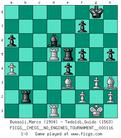 Last move : 1-0 2021 October 17 6:2:7 [Event "FICGS__CHESS__NO_ENGINES_TOURNAMENT__000116"] [Site "FICGS"] [Date "2021.07.06"] [Round "1"] [White "Bussoli,Marco"] [Black "Tedoldi,Guido"] [Result "1-0"] [WhiteElo "1904"] [BlackElo "1563"] 1.d4 e6 2.c4 c5 3.Nf3 cxd4 4.Nxd4 Nc6 5.Nxc6 bxc6 6.g3 Nf6 7.Bg2 d5 8.O-O Bd6 9.Nc3 O-O 10.cxd5 cxd5 11.e4 Bb7 12.exd5 e5 13.Bg5 h6 14.Be3 a6 15.Qb3 Rb8 16.Qc2 Qc7 17.Rac1 Rfe8 18.Ne4 Qxc2 19.Nxf6+ gxf6 20.Rxc2 h5 21.Rfc1 e4 22.Rc4 f5 23.Bh3 Re5 24.Rd1 Bxd5 25.Rcd4 Rb5 26.a4 Rxb2 27.Rxd5 1-0 Queen's pawn Kingside Castling by player White (move 8) Kingside Castling by player Black (move 9) Player White won this chess game. Follow this game move after move (download)It began to feel as though you were playing against Chess itself. - On playing against Robert Fischer. (Walter Shipman) Ohne ihre Erfolge schmälern zu wollen würde ich sagen Petrosian, Spassky und Karpov verdanken ihre Siege ihren Trainern - Boleslavsky, Bondarevsky und Furman. (Mikhail Moiseyevich Botvinik) El ganador de una partida es aquel jugador que hace el penúltimo error. (Savielly Tartakover) Des idées, des idées, j'en ai cent, j'en ai mille. Des bonnes, des mauvaises, applicables, irréalisables... Il suffit de faire le tri ! (Roos) When you've done things right people won't know you've done anything at all. (Futurama)