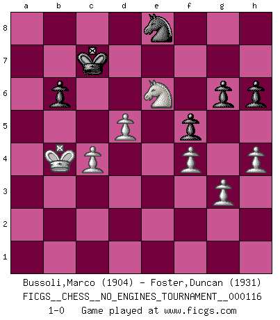 Last move : 1-0 2021 November 6 17:14:53 [Event "FICGS__CHESS__NO_ENGINES_TOURNAMENT__000116"] [Site "FICGS"] [Date "2021.07.06"] [Round "1"] [White "Bussoli,Marco"] [Black "Foster,Duncan"] [Result "1-0"] [WhiteElo "1904"] [BlackElo "1931"] 1.d4 f5 2.c4 Nf6 3.Nc3 e6 4.Nf3 Bb4 5.Bd2 O-O 6.a3 Bxc3 7.bxc3 Ne4 8.e3 b6 9.Bd3 Nc6 10.O-O Ba6 11.Qc2 Nxd2 12.Nxd2 Ne7 13.e4 d5 14.exd5 exd5 15.Rfe1 Qd7 16.Re5 Rae8 17.Rae1 dxc4 18.Nxc4 Ng6 19.R5e3 Rxe3 20.Rxe3 Qd5 21.Qa4 Nf4 22.Bf1 Bb5 23.Qb4 a5 24.Qb3 Ng6 25.Re1 h6 26.Nxa5 Qxb3 27.Nxb3 Bxf1 28.Kxf1 Kf7 29.a4 Ra8 30.Ra1 Nf4 31.g3 Nd5 32.c4 Nb4 33.a5 Ra6 34.axb6 cxb6 35.Rxa6 Nxa6 36.Ke2 Ke6 37.Ke3 Nb4 38.d5+ Ke5 39.f4+ Kd6 40.h4 g6 41.Kd4 Na6 42.Kc3 Nc7 43.Nd4 Ne8 44.Kb4 Kc7 45.Ne6+ 1-0 Dutch with c4 & Nc3 Kingside Castling by player Black (move 5) Kingside Castling by player White (move 10) Player White won this chess game. Follow this game move after move (download)Chess, like love, is infectious at any age. (Flohr) Frage: Was machen Sie mit den Preisen? Anwort: Ich habe Angst, dass meine Freundin davon neue Kleider kauft. (Loek van Wely) Jugadores de primera clase pierden en contra de jugadores de segunda clase porque los jugadores de segunda clase a veces juegan una partida de primer clase. (Siegbert Tarrasch) 'L'échange des dames est un coup dur pour les deux adversaires...' Un journaliste lors d'une partie du match Spassky-Fischer I would love to change the world, but they won't give me the source code. (Unknown)