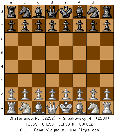 Last move : 0-1 2007 August 23 11:13:35 [Event "FICGS__CHESS__CLASS_M__000012"] [Site "FICGS"] [Date "2007.07.14"] [Round "1"] [White "Shalamanov,Alexander"] [Black "Shpakovsky,Alexander"] [Result "0-1"] [WhiteElo "2252"] [BlackElo "2200"] 0-1 This chess game has been lost on time (started : 2007.07.14 6:12:16) Player Black won this chess game. Follow this game move after move (download)War is the child of passion, passion is the child of narcissism and narcissism is the child. (...) Another game ? (Thibault de Vassal) Das Schach ist nichts für kleine Geister, es beansprucht einen vollen Mann, der sich nicht sklavisch an das Überlieferte hält, sondern selbständig die Tiefen des Spiels zu ergründen sucht. (Wilhelm Steinitz) A la fecha, Fischer esta simplemente un nivel arriba de todos los mejores jugadores de Ajedrez del mundo. (John Jacobs) Tous ces prétendus hommes politiques sont les pions, les Cavaliers, les Tours ou les Fous d'une partie d'échecs qui se jouera tant qu'un hasard ne renversera pas l'échiquier. (Honoré de Balzac) I'll be back. (Arnold Schwarzenegger)