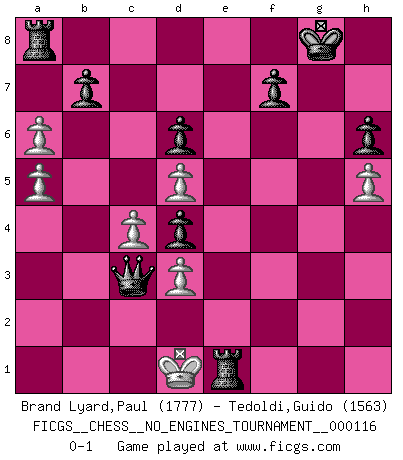 Last move : 0-1 2021 September 16 23:19:41 [Event "FICGS__CHESS__NO_ENGINES_TOURNAMENT__000116"] [Site "FICGS"] [Date "2021.07.06"] [Round "1"] [White "Brand Lyard,Paul"] [Black "Tedoldi,Guido"] [Result "0-1"] [WhiteElo "1777"] [BlackElo "1563"] 1.e4 c5 2.c4 Nc6 3.Nf3 d6 4.d3 e6 5.Nc3 Be7 6.h4 Nf6 7.h5 h6 8.a4 a6 9.a5 O-O 10.Bf4 e5 11.Bxh6 gxh6 12.Nd5 Nxd5 13.exd5 Nd4 14.Nxd4 cxd4 15.g3 Bg5 16.f4 exf4 17.gxf4 Bxf4 18.Rg1+ Bg5 19.Rxg5+ Qxg5 20.Be2 Bh3 21.b4 Rfe8 22.b5 Bg4 23.Kf1 Bxe2+ 24.Ke1 Bxd1 25.Kxd1 Qg1+ 26.Kd2 Qxa1 27.bxa6 Qc3+ 28.Kd1 Re1+ 0-1 Sicilian defense Kingside Castling by player Black (move 9) Player Black won this chess game. Follow this game move after move (download)The game of chess is the touchstone of the intellect. (Goethe) Ein Gewinn durch eine ungenaue Kombination, sei sie auch noch so vorzeigbar, erfüllt mich mit Schaudern. (Wilhelm Steinitz) Evita las multitudes. Haz independientemente tu propio razonamiento. Trata de ser el jugador de Ajedrez, no la pieza de Ajedrez. (Ralph Charell) Je menace de comprendre la position. (Anonyme) Over-the-board chess is the favorite of mortals, correspondence chess is the favorite of the gods. (Eduard Dyckhoff)