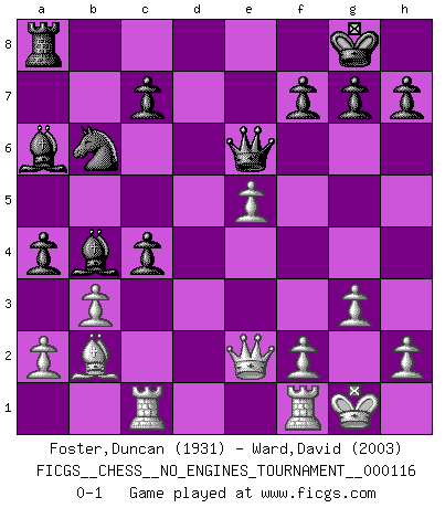 Last move : 0-1 2021 September 8 17:27:23 [Event "FICGS__CHESS__NO_ENGINES_TOURNAMENT__000116"] [Site "FICGS"] [Date "2021.07.06"] [Round "1"] [White "Foster,Duncan"] [Black "Ward,David"] [Result "0-1"] [WhiteElo "1931"] [BlackElo "2003"] 1.e4 e5 2.Nf3 Nc6 3.d4 exd4 4.Nxd4 Nf6 5.Nxc6 bxc6 6.e5 Qe7 7.Qe2 Nd5 8.c4 Nb6 9.Nd2 Qe6 10.b3 a5 11.Bb2 a4 12.g3 Bb4 13.Bg2 O-O 14.O-O d5 15.cxd5 cxd5 16.Rac1 Ba6 17.Nc4 dxc4 18.Bxa8 Rxa8 0-1 Scotch : Mieses variation Kingside Castling by player Black (move 13) Kingside Castling by player White (move 14) Player Black won this chess game. Follow this game move after move (download)During a Chess competition a Chessmaster should be a combination of a beast of prey and a monk. (Alexander Alekhine) Wenn ich mich einlogge, glauben die Leute gewöhnlich nicht, dass ich es selbst bin und sie fangen an, mir dumme Fragen zu stellen. Und wenn sie es glauben, stellen sie wieder andere dumme Fragen. (Judith Polgar) Fischer es el jugador mas fuerte del mundo. De hecho, el jugador mas fuerte que jamas haya existido. (Larry Evans) Le profane ne songe pas à la somme de jouissance dont il se prive, qui méconnaît ce jeu aux ressources aussi variées que passionnantes. (Jean-Marie Jeanton-Lamarche) We need strong personalities and only one world champion to attract sponsors. (Anatoly Karpov)