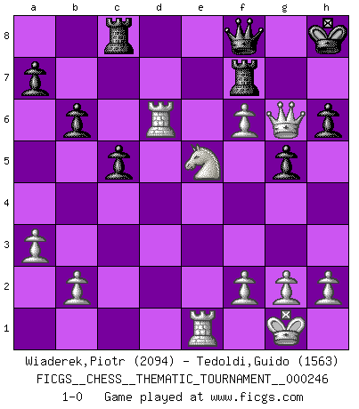 Last move : 1-0 2021 September 23 18:17:4 [Event "FICGS__CHESS__THEMATIC_TOURNAMENT__000246"] [Site "FICGS"] [Date "2021.07.06"] [Round "1"] [White "Wiaderek,Piotr"] [Black "Tedoldi,Guido"] [Result "1-0"] [WhiteElo "2094"] [BlackElo "1563"] 1.d4 Nf6 2.c4 e6 3.Nf3 b6 4.a3 Bb7 5.Nc3 d5 6.cxd5 Nxd5 7.Nxd5 Bxd5 8.Qc2 Be7 9.e4 Bb7 10.Bc4 Nd7 11.Bf4 Rc8 12.O-O Nf6 13.Rfe1 O-O 14.Rad1 h6 15.Bg3 Nh5 16.d5 exd5 17.Bxd5 Bxd5 18.Rxd5 Qe8 19.Rxh5 f6 20.Rf5 Bc5 21.Rd5 c6 22.Rd3 g5 23.Bd6 Bxd6 24.Rxd6 Rf7 25.e5 c5 26.exf6 Qf8 27.Qg6+ Kh8 28.Ne5 1-0 Queen's Indian : Petrosian system Kingside Castling by player White (move 12) Kingside Castling by player Black (move 13) Player White won this chess game. Follow this game move after move (download)Only the player with the initiative has the right to attack. (Wilhelm Steinitz) Es ist im Leben wie im Schachspiel. Wir entwerfen einen Plan, dieser bleibt jedoch bedingt durch das, was im Schachspiel dem Gegner, im Leben dem Schicksal zu tun belieben wird. (Arthur Schopenhauer) No volvere nunca a jugar contigo. Has insultado a mi amigo. - cuando un oponente se maldijo por una mala jugada (Miguel Najdorf) Lorsque vous vous retrouvez devant une position atroce, ne tendez pas un ultime piège dérisoire avec l'intention d'abandonner si l'adversaire le déjoue ! Faites-vous plutôt un devoir de résister comme si votre vie en dépendait. Jouez le coup qui vous déplairait au centuple si vous étiez dans la peau de votre tortionnaire ! Even the best needles are not sharp at both ends. (Chinese proverb)