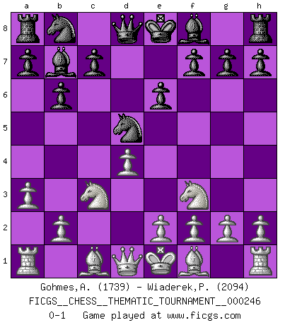 Last move : 0-1 2021 August 16 10:31:14 [Event "FICGS__CHESS__THEMATIC_TOURNAMENT__000246"] [Site "FICGS"] [Date "2021.07.06"] [Round "1"] [White "Gohmes,Abdessamed"] [Black "Wiaderek,Piotr"] [Result "0-1"] [WhiteElo "1739"] [BlackElo "2094"] 1.d4 Nf6 2.c4 e6 3.Nf3 b6 4.a3 Bb7 5.Nc3 d5 6.cxd5 Nxd5 0-1 This chess game has been lost on time (started : 2021.07.06 22:35:3) Queen's Indian : Petrosian system Player Black won this chess game. Follow this game move after move (download)Chess is in its essence a game, in its form an art, and in its execution a science. (Baron Tassilo) Die westlichen Werte sind eine Sprache, welche die Putin-Administration nicht versteht. (Garry Kasparov) En el Ajedrez, tal como en la vida, las bendiciones de hoy pueden ser el veneno del mañana. (Assaic) 'L'échange des dames est un coup dur pour les deux adversaires...' Un journaliste lors d'une partie du match Spassky-Fischer May I never be complete. May I never be content. May I never be perfect. Deliver me, Tyler, from being perfect and complete. (Chuck Palahniuk, Fight Club)