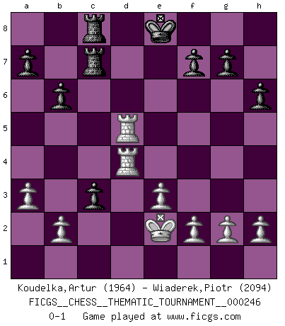 Last move : 0-1 2021 November 21 5:17:28 [Event "FICGS__CHESS__THEMATIC_TOURNAMENT__000246"] [Site "FICGS"] [Date "2021.07.06"] [Round "1"] [White "Koudelka,Artur"] [Black "Wiaderek,Piotr"] [Result "0-1"] [WhiteElo "1964"] [BlackElo "2094"] 1.d4 Nf6 2.c4 e6 3.Nf3 b6 4.a3 Bb7 5.Nc3 d5 6.cxd5 Nxd5 7.Nxd5 Qxd5 8.Bf4 Bd6 9.Bxd6 Qxd6 10.Rc1 Nd7 11.e3 O-O 12.Bb5 c6 13.Be2 Rfd8 14.O-O Qe7 15.Qa4 h6 16.Ba6 Bxa6 17.Qxa6 c5 18.Qb7 Qe8 19.Qc6 e5 20.dxe5 Nxe5 21.Qxe8+ Rxe8 22.Nxe5 Rxe5 23.Rfd1 Kf8 24.Rd7 Re7 25.Rd5 Rc8 26.Kf1 Ke8 27.Rcd1 c4 28.Ke2 Rec7 29.R1d4 c3 0-1 This chess game has been lost on time (started : 2021.07.06 22:35:3) Queen's Indian : Petrosian system Kingside Castling by player Black (move 11) Kingside Castling by player White (move 14) Player Black won this chess game. Follow this game move after move (download)Chess is war over the board. The object is to crush the opponents mind. (Bobby Fischer) Wer mein Gambit spielt, muß bereit sein, alle Brücken hinter sich abzubrechen. Es verändert den ganzen Menschen. Es wirkt wie ein Zauberstab und fördert verkümmerte, gute Charakter- eigenschaften wieder zu Tage. (Emil Joseph Diemer) Cualquier cambio de material en una posición debe venir por medio de un mate, una captura o promoción de Peón. (Purdy) Toute estimation doit être constamment réévaluée. (Jacob Estrin) All the troubles of the world come from being unable to sit alone in a quiet room. (Blaise Pascal)