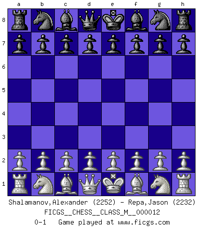 Last move : 0-1 2007 August 23 11:13:35 [Event "FICGS__CHESS__CLASS_M__000012"] [Site "FICGS"] [Date "2007.07.14"] [Round "1"] [White "Shalamanov,Alexander"] [Black "Repa,Jason"] [Result "0-1"] [WhiteElo "2252"] [BlackElo "2232"] 0-1 This chess game has been lost on time (started : 2007.07.14 6:12:16) Player Black won this chess game. Follow this game move after move (download)The older I grow, the more I value Pawns. (Keres) Ich verstehe mehr vom Schach als irgendein anderer lebender Meister. (José Raúl Capablanca) Robert Fischer es la ley hacia si mismo. (Larry Evans) Tout change constamment, y compris dans le monde des Echecs. (Botvinnik) Pretend inferiority and encourage his arrogance. (Sun Tzu)