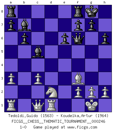 Last move : 1-0 2021 October 19 21:7:4 [Event "FICGS__CHESS__THEMATIC_TOURNAMENT__000246"] [Site "FICGS"] [Date "2021.07.06"] [Round "1"] [White "Tedoldi,Guido"] [Black "Koudelka,Artur"] [Result "1-0"] [WhiteElo "1563"] [BlackElo "1964"] 1.d4 Nf6 2.c4 e6 3.Nf3 b6 4.a3 Bb7 5.Nc3 d5 6.cxd5 Nxd5 7.e4 Nxc3 8.bxc3 Bxe4 9.Ng5 Bc6 10.Nf3 Bd6 11.Be2 O-O 12.O-O h6 13.Be3 Bb7 14.Qc1 Nd7 15.Rd1 Qf6 16.Nd2 c5 17.dxc5 Nxc5 18.Bxc5 Bxc5 19.Bf3 1-0 This chess game has been lost on time (started : 2021.07.06 22:35:3) Queen's Indian : Petrosian system Kingside Castling by player Black (move 11) Kingside Castling by player White (move 12) Player White won this chess game. Follow this game move after move (download)No price is too great for the scalp of the enemy King. (Koblentz) Unter Putin wird alles Geld aus Russland wie von einem Staubsauger nach Moskau umgeleitet, das ist wie ein schwarzes Loch. (Garry Kasparov) El Ajedrez expande y enriquece tu mente. (Saudin Robovic) La vie est comme un jeu d'échecs : nous esquissons un plan, mais celui-ci est tributaire de ce que daignent faire l'adversaire aux échecs et le destin dans la vie. (Arthur Schopenhauer) The best weapon against an enemy is another enemy. (Friedrich Nietzsche)