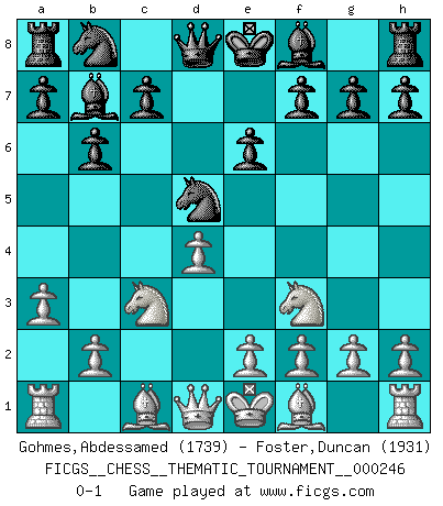 Last move : 0-1 2021 August 16 10:31:14 [Event "FICGS__CHESS__THEMATIC_TOURNAMENT__000246"] [Site "FICGS"] [Date "2021.07.06"] [Round "1"] [White "Gohmes,Abdessamed"] [Black "Foster,Duncan"] [Result "0-1"] [WhiteElo "1739"] [BlackElo "1931"] 1.d4 Nf6 2.c4 e6 3.Nf3 b6 4.a3 Bb7 5.Nc3 d5 6.cxd5 Nxd5 0-1 This chess game has been lost on time (started : 2021.07.06 22:35:3) Queen's Indian : Petrosian system Player Black won this chess game. Follow this game move after move (download)Chess is a foolish expedient for making idle people believe they are doing something very clever when they are only wasting their time. (George Bernard Shaw) Versuche, dich von der Sklaverei der Eröffnungsvarianten zu befreien. Stattdessen soll man gewisse Typenpositionen erlernen, die man eingehend analysiert. (Aaron Nimzowitsch) El Ajedrez es como la guerra en un tablero. (Bobby Fischer) Assurément je connaissais par expérience le mystérieux attrait de ce jeu royal, le seul entre tous les jeux inventés par les hommes qui échappe souverainement à la tyrannie du hasard, le seul où l'on ne doive sa victoire qu'à son intelligence ou plutôt à une certaine forme d'intelligence. Mais n'est-ce pas déjà le limiter injurieusement que d'appeler les échecs un jeu ? N'est-ce pas une science, un art ou quelque chose qui, comme le cercueil de Mahomet entre ciel et terre, est suspendu entre l'un et l'autre, et qui réunit un nombre incroyable de contraires ? [...] C'est une pensée qui ne mène à rien, une mathématique qui n'établit rien, un art qui ne laisse pas d'uvre, une architecture sans matière; et il l'a prouvé néanmoins qu'il était plus durable, à sa manière, que les livres ou que tout autre monument, ce jeu unique qui appartient à tous les peuples et à tous les temps, et dont personne ne sait quel dieu en fit don à la terre pour tuer l'ennui, pour aiguiser l'esprit et stimuler l'âme. Où commence-t-il, où finit-il ? (Stefan Zweig) Looking at the proliferation of personal web pages on the Net, it looks like very soon everyone on Earth will have 15 megabytes of fame. (M.G. Sriram)