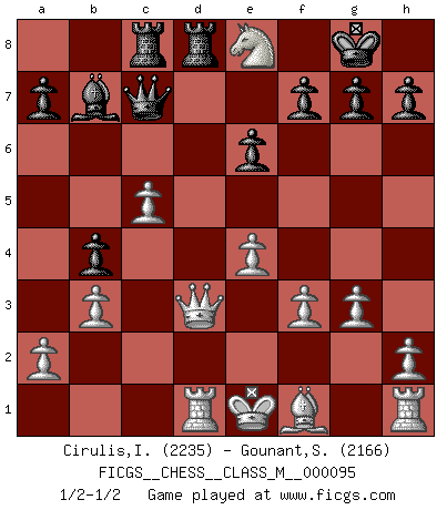 Last move : 1/2-1/2 2021 September 2 22:56:56 [Event "FICGS__CHESS__CLASS_M__000095"] [Site "FICGS"] [Date "2021.07.07"] [Round "1"] [White "Cirulis,Ilmars"] [Black "Gounant,Stanislas"] [Result "1/2-1/2"] [WhiteElo "2235"] [BlackElo "2166"] 1.d4 d5 2.Nf3 Nf6 3.c4 c6 4.Nc3 e6 5.Qd3 dxc4 6.Qxc4 b5 7.Qd3 Bb7 8.e4 b4 9.Na4 Nbd7 10.Be3 Qa5 11.b3 Be7 12.Nd2 O-O 13.f3 Rfd8 14.Nc4 Qc7 15.g3 c5 16.Bf4 Qc8 17.Bd6 Bxd6 18.Nxd6 Qc7 19.Nxc5 Nxc5 20.dxc5 Ne8 21.Rd1 Rac8 22.Nxe8 1/2-1/2 Queen's pawn game Kingside Castling by player Black (move 12) This chess game ended in a draw. Follow this game move after move (download)Chess books should be used as we use glasses: to assist the sight, although some players make use of them as if they thought they conferred sight. (Jose Raul Capablanca) Im Schach nämlich geht es darum, daß Ich des Gegners klein zu kriegen, sein Ego zu zerbrechen und zu zermahlen, seine Selbstachtung zu zertreten und zu verscharren und seine ganze mißachtenswerte sogenannte Persönlichkeit ein für alle Mal tot zu hacken und zu zerstampfen und dadurch die menschliche Gesellschaft von einer stinkenden Pestbeule zu befreien. Es ist ein königliches Spiel. (Robert James Fischer) Diferente gente reacciona diferentemente en aceptar la derrota. (Bobby Fischer) 'L'échange des dames est un coup dur pour les deux adversaires...' Un journaliste lors d'une partie du match Spassky-Fischer A government big enough to give you everything you want is strong enough to take everything you have. (Thomas Jefferson)