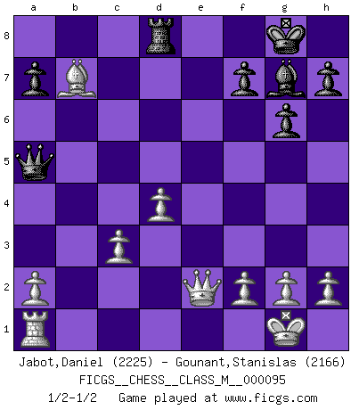 Last move : 1/2-1/2 2021 September 25 23:38:58 [Event "FICGS__CHESS__CLASS_M__000095"] [Site "FICGS"] [Date "2021.07.07"] [Round "1"] [White "Jabot,Daniel"] [Black "Gounant,Stanislas"] [Result "1/2-1/2"] [WhiteElo "2225"] [BlackElo "2166"] 1.e4 c6 2.d4 d5 3.exd5 cxd5 4.c4 Nf6 5.Nc3 g6 6.Qb3 Bg7 7.cxd5 O-O 8.Be2 Nbd7 9.Bf4 Re8 10.Bf3 e5 11.dxe6 Nb6 12.Nge2 Bxe6 13.Qd1 Nfd5 14.O-O Nxf4 15.Nxf4 Bc4 16.Nfe2 Nd5 17.Qd2 Nxc3 18.bxc3 Qa5 19.Rfe1 Rad8 20.Bxb7 Bxe2 21.Rxe2 Rxe2 22.Qxe2 1/2-1/2 Caro-Kann : Panov-Botvinnik attack, 5...g6 Kingside Castling by player Black (move 7) Kingside Castling by player White (move 14) This chess game ended in a draw. Follow this game move after move (download)Mistrust is the most necessary characteristic of the Chess player. (Siegbert Tarrasch) Schach ist gnadenlos. Du mußt bereit sein zu töten. (Nigel Short) Después de la respuesta de las negras a 1.e4 con 1..e5, se quedan siempre tratando de entrar dentro del juego. (Howard Staunton) Le jeu d'échecs est comme rejeté hors du temps. (Antoine de Saint-Exupéry) The right perception of any matter and a misunderstanding of the same matter do not wholly exclude each other. (Kafka's the trial)
