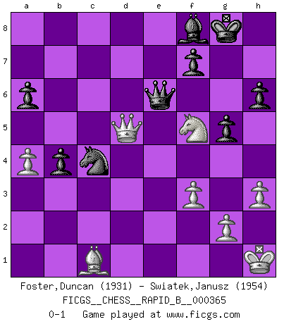 Last move : 0-1 2021 September 22 14:59:3 [Event "FICGS__CHESS__RAPID_B__000365"] [Site "FICGS"] [Date "2021.07.09"] [Round "1"] [White "Foster,Duncan"] [Black "Swiatek,Janusz"] [Result "0-1"] [WhiteElo "1931"] [BlackElo "1954"] 1.e4 c5 2.a3 g6 3.b4 Bg7 4.Nc3 Nf6 5.e5 Nh5 6.bxc5 d6 7.Bb5+ Nc6 8.exd6 exd6 9.cxd6 Qxd6 10.Nge2 a6 11.Bxc6+ Qxc6 12.O-O b5 13.d4 O-O 14.Rb1 Re8 15.d5 Qd6 16.Rb4 Bb7 17.Qd3 Nf6 18.Bf4 Qd7 19.d6 Qc6 20.f3 Nd7 21.Kh1 Rac8 22.Re4 Red8 23.Re3 Nb6 24.Rd1 Nc4 25.d7 Ra8 26.h3 h6 27.Re7 Qf6 28.Re8+ Rxe8 29.dxe8Q+ Rxe8 30.Bc1 Ne5 31.Qe3 Qc6 32.Nd5 Qxc2 33.Ndc3 g5 34.Nd4 Qg6 35.Nce2 Rd8 36.Ng3 Nc4 37.Qe7 Qb6 38.Ngf5 Bf8 39.Qe2 Bc8 40.a4 Bxf5 41.Nxf5 Rxd1+ 42.Qxd1 b4 43.Qd5 Qe6 0-1 Sicilian defense Kingside Castling by player White (move 12) Kingside Castling by player Black (move 13) Promotion Queen by player White (move 29) Player Black won this chess game. Follow this game move after move (download)The sign of a great Master is his ability to win a won game quickly and painlessly. (Irving Chernev) Ein guter Spieler hat immer Glück. (José Raúl Capablanca) Con el tiempo, empecé a progresar en partidas decisivas. Tal vez porque me di cuenta de una simple verdad: no solo estaba yo nervioso sino también mi oponente. (Mikhail Tal) En blitz, le Cavalier l'emporte sur le Fou. (Vlastimil Hort) My poor ole parrot... Is not in the circulation of displays ....poo hoo hoo :) (Wayne Lowrance's enigma)