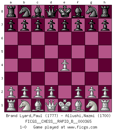 Last move : 1-0 2021 August 8 18:16:21 [Event "FICGS__CHESS__RAPID_B__000365"] [Site "FICGS"] [Date "2021.07.09"] [Round "1"] [White "Brand Lyard,Paul"] [Black "Allushi,Nazmi"] [Result "1-0"] [WhiteElo "1777"] [BlackElo "1700"] 1.e4 1-0 This chess game has been lost on time (started : 2021.07.09 2:7:9) King's pawn Opening Player White won this chess game. Follow this game move after move (download)In complicated positions, Bobby Fischer hardly had to be afraid of anybody. (Paul Keres) Auf Remis zu spielen ist gewissermaßen ein Verbrechen gegen das Schachspiel. (Mikhail Nekhemyevich Tal) El Ajedrez es tortura mental. (Garry Kasparov) Horreur, mais aussi harmonie suprême : qu'y avait-il en effet au monde en dehors des échecs ? Le brouillard, l'inconnu, le non-être... (Vladimir Nabokov) It's not enough to succeed. Others must fail. (Gore Vidal)