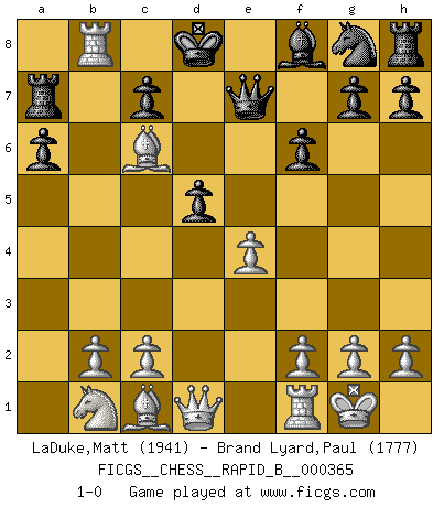 Last move : 1-0 2021 July 21 5:29:7 [Event "FICGS__CHESS__RAPID_B__000365"] [Site "FICGS"] [Date "2021.07.09"] [Round "1"] [White "LaDuke,Matt"] [Black "Brand Lyard,Paul"] [Result "1-0"] [WhiteElo "1941"] [BlackElo "1777"] 1.e4 e5 2.Nf3 Nc6 3.Bb5 f6 4.O-O d6 5.d4 a6 6.Ba4 b5 7.Bb3 exd4 8.a4 bxa4 9.Rxa4 Bb7 10.Nxd4 Qd7 11.Be6 Qe7 12.Bd5 Ra7 13.Nxc6 Bxc6 14.Bxc6+ Kd8 15.Rb4 d5 16.Rb8+ 1-0 Ruy Lopez : Nuernberg variation Kingside Castling by player White (move 4) Player White won this chess game. Follow this game move after move (download)You are for me the Queen on d8 and I am the Pawn on d7 !! (Eduard Gufeld) Es ist besser die Steine des Gegners zu opfern. (Savielly Grigorievitsch Tartakower) Debes de llevar a tu oponente hacia un profundo y obscuro bosque donde 2+2=5, y el camino que conduce a la salida es suficientemente ancho para solamente uno. (Mikhail Tal) Shah mat. Le roi est mort. Cri de fierté d'un joueur venant de terrasser son adversaire, courtoisement, sans effusion de sang. There is a great deal of difference between an eager man who wants to read a book and a tired man who wants a book to read. (G.K. Chesterton)