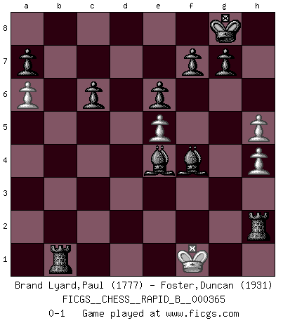 Last move : 0-1 2021 September 3 1:12:37 [Event "FICGS__CHESS__RAPID_B__000365"] [Site "FICGS"] [Date "2021.07.09"] [Round "1"] [White "Brand Lyard,Paul"] [Black "Foster,Duncan"] [Result "0-1"] [WhiteElo "1777"] [BlackElo "1931"] 1.e4 c6 2.d4 d5 3.e5 Bf5 4.f4 e6 5.Nf3 h5 6.h4 Nh6 7.Nc3 c5 8.dxc5 Bxc5 9.Bb5+ Nc6 10.Bxc6+ bxc6 11.a4 O-O 12.Ng5 Ng4 13.Rh3 Nf2 14.Qxh5 Nxh3 15.gxh3 Bxc2 16.Kd2 Bg6 17.Qg4 d4 18.Ne2 Bf5 19.Qh5 Qa5+ 20.Nc3 dxc3+ 21.bxc3 Be3+ 22.Ke2 Qxc3 23.Rb1 Qd3+ 24.Ke1 Qxb1 25.Qd1 Qxc1 26.Qxc1 Bxc1 27.h5 Bxf4 28.Nf3 Rab8 29.Nd4 Be4 30.a5 Rb1+ 31.Kf2 Rfb8 32.Ne2 R1b2 33.h4 R8b3 34.Ke1 Re3 35.a6 R3xe2+ 36.Kf1 Rf2+ 37.Ke1 Rh2 38.Kf1 Rb1+ 0-1 Caro-Kann : Advance variation Kingside Castling by player Black (move 11) Player Black won this chess game. Follow this game move after move (download)I'd rather have a Pawn than a finger. (Reuben Fine) Ich verlor meine Bürgerrechte, mein Gehalt wurde mir nicht mehr bezahlt und ich wurde zensiert und durfte nicht mehr ins Ausland reisen. [nach dem Match Fischer-Taimanov 6:0] (Mark Taimanov) Me gusta decir que Bobby Fischer fue el mejor jugador que jamás haya existido. Pero lo que hizo de Fischer un genio, fue su habilidad de mezclar una frescura y pragmatismo Americano con ideas Rusas acerca de la estrategia. (Bruce Pandolfini) Avec des compensations pour le matériel en plus... (Anonyme) Control your own destiny or someone else will. (Jack Welch)