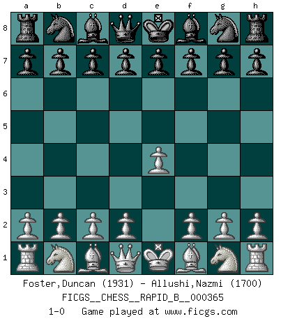 Last move : 1-0 2021 August 8 18:16:21 [Event "FICGS__CHESS__RAPID_B__000365"] [Site "FICGS"] [Date "2021.07.09"] [Round "1"] [White "Foster,Duncan"] [Black "Allushi,Nazmi"] [Result "1-0"] [WhiteElo "1931"] [BlackElo "1700"] 1.e4 1-0 This chess game has been lost on time (started : 2021.07.09 2:7:9) King's pawn Opening Player White won this chess game. Follow this game move after move (download)Not only will I predict his triumph over Botvinnik, but I'll go further and say that he'll probably be the greatest Chess player that ever lived. (John Collins) Jeder leidlich begabte Spieler, er braucht keineswegs hervorragend veranlagt zu sein, kann es zum Meister bringen. Aber das ist ja auch gar nicht nötig! Der richtige Standpunkt ist es, zu seinem Vergnügen zu spielen, und man glaube ja nicht, dass der Genuss proportional dem Können sei. (Siegbert Tarrasch) Antes de los Finales, los dioses han colocado el Juego Medio. (Siegbert Tarrasch) Que feriez-vous si vous étiez en train de jouer aux échecs et que la fin du monde arrive ? Je continuerais à jouer. (Saint Borromée) The obstacle is the path. (Zen proverb)