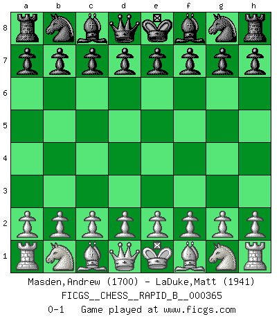 Last move : 0-1 2021 August 8 3:54:56 [Event "FICGS__CHESS__RAPID_B__000365"] [Site "FICGS"] [Date "2021.07.09"] [Round "1"] [White "Masden,Andrew"] [Black "LaDuke,Matt"] [Result "0-1"] [WhiteElo "1700"] [BlackElo "1941"] 0-1 This chess game has been lost on time (started : 2021.07.09 2:7:9) Player Black won this chess game. Follow this game move after move (download)If cunning alone were needed to excel, women would be the best Chess players. (Albin) Es gibt nur zwei wahre Schachgenies - das andere war Wilhelm Steinitz, der Weltmeister von 1872 bis 1894. (Robert James Fischer) Puntos débiles o agujeros en la posición de tu oponente deben de ser ocupados por piezas, no Peones. (Siegbert Tarrasch) Le pion, dans sa simplicité, marche droit devant lui, mais lorsqu'il prend, il le fait obliquement? Ainsi l'homme, tant qu'il reste pauvre, marche dans la droiture et vit honnêtement, mais lorsqu'il recherche les honneurs, il flatte, se parjure et, par les voies obliques, cherche une position supérieure sur l'échiquier du monde. (Jean de Galles) God, you are such an idiot. - Actually, I thought I was more of a jerk. (Gregory House to Stacy Warner, House M.D.)