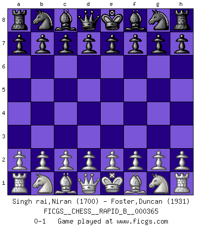 Last move : 0-1 2021 August 8 3:54:56 [Event "FICGS__CHESS__RAPID_B__000365"] [Site "FICGS"] [Date "2021.07.09"] [Round "1"] [White "Singh rai,Niran"] [Black "Foster,Duncan"] [Result "0-1"] [WhiteElo "1700"] [BlackElo "1931"] 0-1 This chess game has been lost on time (started : 2021.07.09 2:7:9) Player Black won this chess game. Follow this game move after move (download)Winning isn't everything... but losing is nothing. (Mednis) Das ganze Leben mit einer Ehefrau ist wie ein Endspiel mit ungleichfarbigen Läufern. (Viktor Kortschnoi) El Ajedrez por encima de todo... ¡es una pelea!. (Emanuel Lasker) Un footballeur joue avec ses pieds, parfois avec sa tête. Un joueur d'échecs ne joue qu'avec sa tête. Et quand il ne joue plus, il meurt. (Jacob Murray) Over-the-board chess is the favorite of mortals, correspondence chess is the favorite of the gods. (Eduard Dyckhoff)