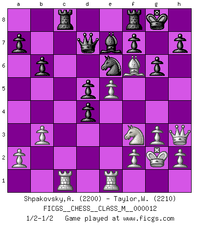 Last move : 1/2-1/2 2007 November 25 13:25:43 [Event "FICGS__CHESS__CLASS_M__000012"] [Site "FICGS"] [Date "2007.07.14"] [Round "1"] [White "Shpakovsky,Alexander"] [Black "Taylor,William"] [Result "1/2-1/2"] [WhiteElo "2200"] [BlackElo "2210"] 1.d4 Nf6 2.c4 e6 3.Nf3 b6 4.g3 Ba6 5.b3 Bb4+ 6.Bd2 Be7 7.Nc3 O-O 8.e4 d5 9.cxd5 Bxf1 10.Kxf1 exd5 11.e5 Ne4 12.Kg2 Qd7 13.Re1 Nxc3 14.Bxc3 Nc6 15.Qd3 Nd8 16.Bd2 Ne6 17.Rac1 Rac8 18.Qf5 c5 19.Bg5 g6 20.Qh3 cxd4 21.Bf6 1/2-1/2 Queen's Indian : Nimzovich variation (exaggerated Fianchetto) Kingside Castling by player Black (move 7) This chess game ended in a draw. Follow this game move after move (download)By this measure (on the gap between Fischer & his contemporaries), I consider him the greatest world champion. (Garry Kasparov) Der Verteidiger gebe der Gewalt nach, aber nur der Gewalt. Er schaffe sich nicht freiwillig, etwa aus Blindheit oder aus Schrecken, irgendwelche Schwächen. Er lasse sich nicht bluffen. (Emanuel Lasker) Hasta este punto, las blancas han seguido un análisis bien conocido. Pero ahora el hace un error fatal: empieza a usar su propia cabeza. (Siegbert Tarrasch) Il n'y a pas de prix trop élevé au scalp de l'ennemi. (Koblentz) Ah, the Socrating method. The best way we have of teaching everything-apart from juggling chainsaws. (Gregory House, House M.D.)