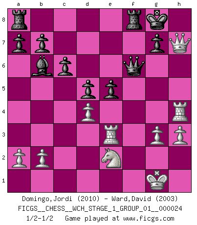 Last move : 1/2-1/2 2021 September 10 9:47:17 [Event "FICGS__CHESS__WCH_STAGE_1_GROUP_01__000024"] [Site "FICGS"] [Date "2021.07.11"] [Round "1"] [White "Domingo,Jordi"] [Black "Ward,David"] [Result "1/2-1/2"] [WhiteElo "2010"] [BlackElo "2003"] 1.e4 e5 2.Nf3 Nc6 3.Bc4 Bc5 4.c3 Nf6 5.d4 exd4 6.e5 d5 7.Bb5 Ne4 8.cxd4 Bb6 9.Be3 O-O 10.Nc3 Bg4 11.h3 Bh5 12.Qc2 Bg6 13.Qb3 Ne7 14.O-O c6 15.Bd3 Nf5 16.Rfe1 Nxe3 17.Rxe3 Ng5 18.Nxg5 Qxg5 19.Ne2 f6 20.f4 Qh4 21.Bxg6 hxg6 22.Qd3 g5 23.Rf1 gxf4 24.Rxf4 Qh6 25.g3 fxe5 26.Rh4 Qf6 27.Qh7+ Kf7 28.Qh5+ Kg8 29.Qh7+ Kf7 30.Qh5+ Kg8 31.Qh7+ 1/2-1/2 Giuoco Piano Kingside Castling by player Black (move 9) Kingside Castling by player White (move 14) This chess game ended in a draw. Follow this game move after move (download)Chess is 99 percent tactics. (Teichmann) Dieses schreckliche Gefühl, dass ich gegen eine Maschine spielte, die niemals Fehler macht, zerschmetterte meinen Widerstand. (Mark Taimanov) Fischer era un maestro de claridad y un Rey del posicionamiento astuto. Sus oponentes podían ver hacia donde se dirigía pero eran impotentes para detenerlo. (Bruce Pandolfini) On croit qu'il y a plus de mauvais joueurs que de bons joueurs, c'est faux : Il y a autant de joueurs qui gagnent que de joueurs qui perdent. (Philippe Geluck) Now the reason the enlightened prince and the wise general conquer the enemy whenever they move and their achievements surpass those of ordinary men is foreknowledge. (Sun Tzu)