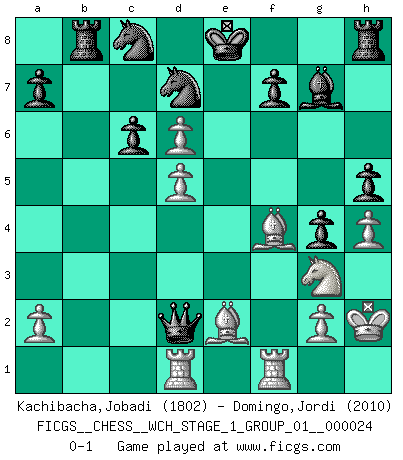 Last move : 0-1 2021 October 20 12:58:50 [Event "FICGS__CHESS__WCH_STAGE_1_GROUP_01__000024"] [Site "FICGS"] [Date "2021.07.11"] [Round "2"] [White "Kachibacha,Jobadi"] [Black "Domingo,Jordi"] [Result "0-1"] [WhiteElo "1802"] [BlackElo "2010"] 1.c4 g5 2.d4 h6 3.Nc3 Bg7 4.e4 d6 5.Be3 Nf6 6.f3 Nc6 7.Nge2 e5 8.d5 Ne7 9.Ng3 c5 10.dxc6 bxc6 11.Qd2 Be6 12.Rd1 Nc8 13.h4 g4 14.f4 exf4 15.Bxf4 Qa5 16.Be2 Rb8 17.O-O h5 18.e5 Nd7 19.exd6 Qb6+ 20.Kh2 Qxb2 21.Nd5 Bxd5 22.cxd5 Qxd2 0-1 This chess game has been lost on time (started : 2021.07.11 16:47:18) English Opening Kingside Castling by player White (move 17) Player Black won this chess game. Follow this game move after move (download)Help your pieces so they can help you. (Paul Morphy) Im Blitz ist es einfacher mit einer Figur weniger anzugreifen, als sich mit einer Mehrfigur zu verteidigen. (Mikhail Nekhemyevich Tal) El Ajedrez, como cualquier otra actividad creativa, puede existir solo a través de méritos combinados de aquellos que tienen talento creativo y de aquellos que tienen la habilidad de organizar un trabajo creativo. (Mikhail Botvinnik) C'est une question de caractère, Beaucoup de gens perdent leur motivation très vite. D'autres, ils sont rares, peuvent la conserver très longtemps. J'aime les échecs, encore aujourd'hui je suis heureux d'analyser des parties. J'aime toujours gagner, je déteste encore perdre. Bien jouer est important pour mon intégrité intellectuelle et morale. Et puis les échecs vivent en ce moment une période historique grâce à Internet. Ils se développent dans les systèmes éducatifs à travers le monde. Ils sortent de leur ghetto, et c'est mon rôle de mener à bien cette révolution. (Gary Kasparov) Fame, I have already. Now I need the money. (an elderly Steinitz)