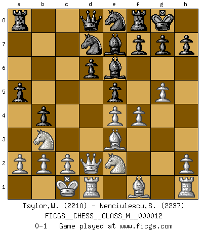 Last move : 0-1 2007 November 28 19:37:29 [Event "FICGS__CHESS__CLASS_M__000012"] [Site "FICGS"] [Date "2007.07.14"] [Round "1"] [White "Taylor,William"] [Black "Nenciulescu,Silviu"] [Result "0-1"] [WhiteElo "2210"] [BlackElo "2237"] 1.e4 c5 2.Nf3 d6 3.d4 cxd4 4.Nxd4 Nf6 5.Nc3 a6 6.Be3 e5 7.Nb3 Be6 8.f3 Be7 9.Qd2 O-O 10.O-O-O Nbd7 11.g4 b5 12.g5 b4 13.Ne2 Ne8 14.f4 a5 0-1 This chess game has been lost on time (started : 2007.07.14 6:12:16) Sicilian : Najdorf, Byrne (English) attack Kingside Castling by player Black (move 9) Queenside Castling by player White (move 10) Player Black won this chess game. Follow this game move after move (download)Is Bobby Fischer quite sane ? (Salo Flohr) Irgendwie scheint mir sonntags früh um 9 Uhr der Killerinstinkt verloren gegangen zu sein. (Alexej Shirov) Cada Peón es una Reina en potencia. (James Mason) Il vaut toujours mieux jouer un plan faux de façon logique que de n'avoir pas de plan du tout. (Victor Kortchnoï) Experience is the name we all give to our mistakes. (Oscar Wilde)