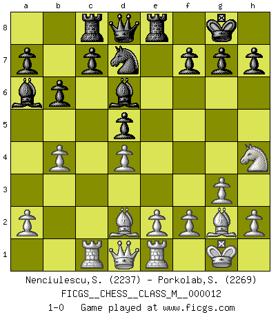 Last move : 1-0 2007 November 22 7:32:58 [Event "FICGS__CHESS__CLASS_M__000012"] [Site "FICGS"] [Date "2007.07.14"] [Round "1"] [White "Nenciulescu,Silviu"] [Black "Porkolab,Sandor"] [Result "1-0"] [WhiteElo "2237"] [BlackElo "2269"] 1.d4 Nf6 2.c4 e6 3.Nf3 b6 4.g3 Ba6 5.b3 Bb4+ 6.Bd2 Be7 7.Bg2 O-O 8.O-O d5 9.cxd5 Nxd5 10.Nc3 Nd7 11.Nxd5 exd5 12.Rc1 Re8 13.Re1 Rc8 14.b4 Bd6 15.Nh4 1-0 This chess game has been lost on time (started : 2007.07.14 6:12:16) Queen's Indian : Nimzovich variation (exaggerated Fianchetto) Kingside Castling by player Black (move 7) Kingside Castling by player White (move 8) Player White won this chess game. Follow this game move after move (download)Who is your opponent tonight, tonight I am playing against the Black pieces. (Akiba Rubinstein) Zu meiner Zeit war ein 20 jähriger ein junger Spieler, heute ist er ein Veteran. (Garry Kasparov) Un jugador que trata de regresar una movida en el Ajedrez es un futuro carterista. (Richard Fenton) La vérité est comme le meilleur coup aux échecs : elle existe, mais il faut la chercher. (Arturo Perez-Reverte) A mistake is only a mistake if you let it happen twice. Otherwise it is a learning experience. (Daniel Parmet)