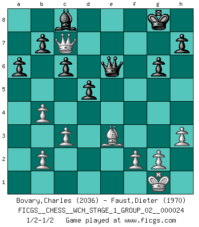 Last move : 1/2-1/2 2021 September 7 13:6:56 [Event "FICGS__CHESS__WCH_STAGE_1_GROUP_02__000024"] [Site "FICGS"] [Date "2021.07.11"] [Round "1"] [White "Bovary,Charles"] [Black "Faust,Dieter"] [Result "1/2-1/2"] [WhiteElo "2036"] [BlackElo "1970"] 1.e4 e6 2.d4 d5 3.Nc3 Nc6 4.Nf3 Nge7 5.Bd3 g6 6.O-O Bg7 7.e5 O-O 8.Ne2 f6 9.exf6 Bxf6 10.Bh6 Rf7 11.Qd2 e5 12.Ng5 Bxg5 13.Bxg5 Qd6 14.c3 Bd7 15.Bc2 Re8 16.Bb3 exd4 17.Rfe1 Na5 18.Nxd4 Nxb3 19.axb3 a6 20.Nf3 Nc6 21.Rxe8+ Bxe8 22.Re1 Bd7 23.Re3 Bf5 24.h3 Be6 25.Bh6 Re7 26.Nd4 Bd7 27.Rf3 Re8 28.Bf4 Qe7 29.Re3 Qf7 30.Nxc6 Bxc6 31.Rxe8+ Bxe8 32.b4 c6 33.Qe3 Bd7 34.Bh6 Bc8 35.Qe5 Bd7 36.Be3 Qe6 37.Qb8+ Bc8 38.Qc7 1/2-1/2 French : Paulsen variation Kingside Castling by player White (move 6) Kingside Castling by player Black (move 7) This chess game ended in a draw. Follow this game move after move (download)No price is too great for the scalp of the enemy King. (Koblentz) Gewinnen beim Schach fördert das Selbstvertrauen. Beim Sex spüre ich sowas nicht... (Garry Kasparov) En partidas rápidas, el Caballo es mas poderoso que el Alfil. (Vlastimil Hort) On croit qu'il y a plus de mauvais joueurs que de bons joueurs, c'est faux : Il y a autant de joueurs qui gagnent que de joueurs qui perdent. (Philippe Geluck) When you stop learning you start dying. (Scott Adams)