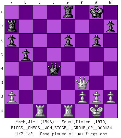 Last move : 1/2-1/2 2021 October 4 14:35:26 [Event "FICGS__CHESS__WCH_STAGE_1_GROUP_02__000024"] [Site "FICGS"] [Date "2021.07.11"] [Round "2"] [White "Mach,Jiri"] [Black "Faust,Dieter"] [Result "1/2-1/2"] [WhiteElo "1846"] [BlackElo "1970"] 1.c4 Nf6 2.Nc3 c5 3.Nf3 d5 4.cxd5 Nxd5 5.d4 Nxc3 6.bxc3 g6 7.Bf4 Bg7 8.e3 Qa5 9.Qd2 Nc6 10.Rb1 a6 11.Bd3 O-O 12.O-O cxd4 13.exd4 e5 14.Bxe5 Nxe5 15.Nxe5 Bxe5 16.dxe5 Rd8 17.Qe2 Re8 18.Rfe1 Qxc3 19.Bc4 b5 20.Rbc1 Qd4 21.Qf3 Ra7 22.e6 Bxe6 23.Bxe6 fxe6 1/2-1/2 English Opening Kingside Castling by player Black (move 11) Kingside Castling by player White (move 12) This chess game ended in a draw. Follow this game move after move (download)A good sacrifice is one that is not necessarily sound but leaves your opponent dazed and confused. (Rudolph Spielmann) Wir irren allesamt, nur jeder irrt anders. (Georg Christoph Lichtenberg) El sobresalir en el Ajedrez es un signo de una mente intrigante. (Sir Arthur Conan Doyle) Les échecs sont utiles à l'exercice de la faculté de penser et à celle de l'imagination. Car nous devons posséder une méthode élaborée pour atteindre des buts partout où nous devons conduire notre raison. (Leibnitz) Nobody is always a winner, and anybody who says he is, is either a liar or doesn't play poker. (Amarillo Slim)