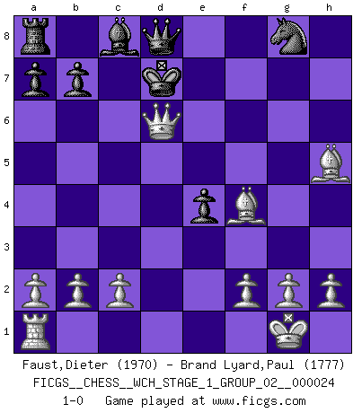 Last move : 1-0 2021 August 4 9:51:2 [Event "FICGS__CHESS__WCH_STAGE_1_GROUP_02__000024"] [Site "FICGS"] [Date "2021.07.11"] [Round "2"] [White "Faust,Dieter"] [Black "Brand Lyard,Paul"] [Result "1-0"] [WhiteElo "1970"] [BlackElo "1777"] 1.e4 e5 2.Nf3 Nc6 3.Bb5 f6 4.O-O h5 5.d4 exd4 6.Nxd4 Nxd4 7.Qxd4 c6 8.Be2 g5 9.Bxg5 Rh7 10.Bf4 d6 11.Rd1 f5 12.Nd2 c5 13.Qe3 Re7 14.Bxh5+ Kd7 15.Nb3 Rxe4 16.Nxc5+ Kc7 17.Nxe4 fxe4 18.Rxd6 Bxd6 19.Qc5+ Kd7 20.Qxd6+ 1-0 Ruy Lopez : Nuernberg variation Kingside Castling by player White (move 4) Player White won this chess game. Follow this game move after move (download)Suddenly it was obvious to me in my analysis I had missed what Fischer had found with the greatest of ease at the board. (Mikhail Botvinnik) Der Knackpunkt bei der Konzentration ist, daß wir nur durch sie etwas Neues und Ungewöhnliches am Schachbrett finden können. Sie ist der einzige Weg durch neue neue Ideen eine Überraschung zu bereiten. (Garry Kasparov) El tablero es el mundo, las piezas es el fenomeno del universo, las reglas del juego son lo que llamamos leyes de la naturaleza y el jugador del lado opuesto, se encuentra oculto a nuestra vista. (Thomas Huxley) La tactique est l'élément le plus important du milieu de jeu. (Siegbert Tarrasch) Ah, beer! The cause of, and the solution to, all of life's problems. (Homer Simpson)