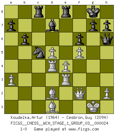 Last move : 1-0 2021 November 6 2:32:16 [Event "FICGS__CHESS__WCH_STAGE_1_GROUP_03__000024"] [Site "FICGS"] [Date "2021.07.11"] [Round "1"] [White "Koudelka,Artur"] [Black "Cesbron,Guy"] [Result "1-0"] [WhiteElo "1964"] [BlackElo "2094"] 1.c4 e5 2.Nc3 Nf6 3.Nf3 Nc6 4.g3 d5 5.cxd5 Nxd5 6.Bg2 Nb6 7.O-O Be7 8.d3 O-O 9.a3 Be6 10.b4 f6 11.Ne4 Qd7 12.Bb2 Rfd8 13.Qc2 Bf8 14.Rac1 Qf7 15.b5 Na5 16.Nfd2 Nd5 17.Nc5 Bxc5 18.Qxc5 Rac8 19.f4 b6 20.Qf2 exf4 21.gxf4 Ne7 22.Bc3 Nb3 23.Nxb3 Bxb3 24.f5 c5 25.bxc6 Nxc6 26.d4 Na5 27.e4 Bc4 28.Rfe1 Nb3 29.Rcd1 Bb5 30.Re3 Nc5 31.d5 Qh5 32.Bf3 Qh6 33.Rd4 Bd7 34.Bd1 Re8 35.Bd2 1-0 English Opening Kingside Castling by player White (move 7) Kingside Castling by player Black (move 8) Player White won this chess game. Follow this game move after move (download)The mistakes are there, waiting to be made. (Savielly Tartakower) Es genügt nicht ein guter Spieler zu sein, man muß auch gut spielen. (Siegbert Tarrasch) El Ajedrez es parte de una cultura y si una cultura esta en decadencia, entonces también el Ajedrez declinará. (Mikhail Botvinnik) La tactique, c'est ce que vous faites quand il y a quelque chose à faire; la stratégie, c'est ce que vous faites quand il n'y a rien à faire. (Savielli Tartacower) I don't believe in psychology. I believe in good moves. (Bobby Fischer)