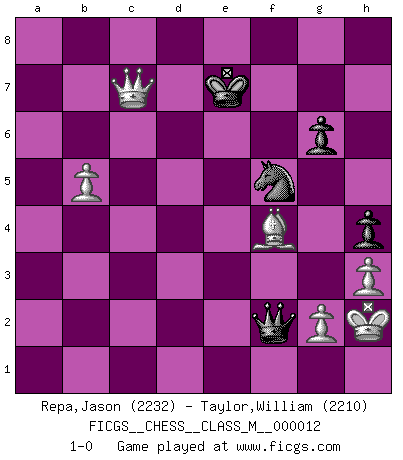Last move : 1-0 2009 February 12 17:29:35 [Event "FICGS__CHESS__CLASS_M__000012"] [Site "FICGS"] [Date "2007.07.14"] [Round "1"] [White "Repa,Jason"] [Black "Taylor,William"] [Result "1-0"] [WhiteElo "2232"] [BlackElo "2210"] 1.f4 d5 2.Nf3 Nf6 3.e3 g6 4.b3 Bg7 5.Bb2 c5 6.Bb5+ Bd7 7.Bxd7+ Qxd7 8.O-O O-O 9.d3 Nc6 10.Re1 d4 11.Ne5 Qc7 12.Nxc6 Qxc6 13.e4 e5 14.fxe5 Nd7 15.Bc1 Nxe5 16.Nd2 Rae8 17.Rf1 Re7 18.Rb1 b5 19.Nf3 Ng4 20.Re1 Qd6 21.h3 Ne5 22.Rf1 Nc6 23.Bg5 f6 24.Bd2 R7e8 25.Qc1 Nd8 26.a4 b4 27.Qe1 f5 28.Qh4 Bf6 29.Bf4 Qd7 30.Bg5 fxe4 31.Bxf6 exf3 32.Rxf3 Nc6 33.Qh6 Rf7 34.Qg5 Qd6 35.Qh4 Nb8 36.Rbf1 Nd7 37.Bg5 Rxf3 38.Rxf3 Qd5 39.Bf4 Qc6 40.Bh6 Qd6 41.Rf1 Qe7 42.Qg3 Ne5 43.Bg5 Qd7 44.Re1 Nf7 45.Bf4 a6 46.Kh2 Kg7 47.Rxe8 Qxe8 48.Bb8 Qe2 49.Qc7 Qxc2 50.Qe7 Kg8 51.Qe6 Qxd3 52.Be5 Kf8 53.Bf6 Qe3 54.Qc8+ Qe8 55.Bg7+ Ke7 56.Qxc5+ Nd6 57.Bxd4 Ke6 58.Be3 Qc8 59.Qxb4 Qc6 60.Bf4 Nf5 61.Qb8 Ne7 62.Qh8 h5 63.Qe5+ Kd7 64.Qe2 Nd5 65.Qd3 Ke8 66.Qe4+ Kd7 67.Qd4 Ke6 68.Bg3 Ne7 69.b4 Nf5 70.Qe5+ Kd7 71.b5 axb5 72.axb5 Qb6 73.Qd5+ Ke8 74.Bf4 h4 75.Qa8+ Kd7 76.Qa6 Qf2 77.Qc6+ Ke7 78.Qc7+ 1-0 Bird's Opening Kingside Castling by player White (move 8) Kingside Castling by player Black (move 8) Player White won this chess game. Follow this game move after move (download)Chess is a terrible game. If you have no center, your opponent has a freer position. If you do have a center, then you really have something to worry about ! (Siegbert Tarrasch) Ein Remis kann durch Wiederholung von drei Zügen oder durch einen schlechte Zug erreicht werden. (Savielly Grigorievitsch Tartakower) Aquel que toma al Peón de Caballo de la Reina, se pasará la noche a dormir en la calle. (Anónimo) Je crois qu'il existe des manières très spécifiques de jouer efficacement contre une machine. Evidemment, nous n'avons aucune chance en technique pure, parce que l'ordinateur calcule de manière parfaite. Mais lorsque nous faisons appel à notre cerveau, en utilisant l'intuition et la compréhension, alors nous restons beaucoup plus forts. (Anatoli Karpov) CHESS, n. f. [echecs, Fr.] A nice and abstruse game, in which two sets of puppets are moved in opposition to each other. (Dr Samuel Johnson, A Dictionary Of The English Language, 1755)