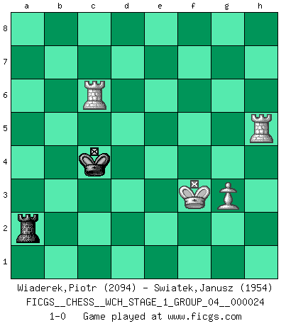 Last move : 1-0 2021 October 1 9:16:50 [Event "FICGS__CHESS__WCH_STAGE_1_GROUP_04__000024"] [Site "FICGS"] [Date "2021.07.11"] [Round "2"] [White "Wiaderek,Piotr"] [Black "Swiatek,Janusz"] [Result "1-0"] [WhiteElo "2094"] [BlackElo "1954"] 1.c4 c5 2.Nf3 Nf6 3.Nc3 e6 4.g3 Be7 5.Bg2 d5 6.cxd5 exd5 7.d4 c4 8.O-O Nc6 9.b3 cxb3 10.axb3 O-O 11.Bg5 Bf5 12.Ne5 Nb4 13.Bxf6 Bxf6 14.e4 dxe4 15.Nxe4 Bxe4 16.Bxe4 Bxe5 17.dxe5 Qb6 18.Qd6 Nc6 19.e6 fxe6 20.Qxe6+ Kh8 21.Rad1 Rae8 22.Qd5 Re5 23.Qd3 h6 24.Kg2 Na5 25.Rb1 Rb5 26.Qd7 Rxb3 27.Rbc1 Rb2 28.Qf7 Qf6 29.Qxf6 gxf6 30.Rc7 Rb4 31.Bc2 f5 32.Bd3 Rd4 33.Bb1 Rg4 34.Rd7 Nc6 35.Rxb7 Rg7 36.Rb5 f4 37.Rc1 fxg3 38.hxg3 Ne7 39.Ba2 Rg5 40.Rb7 Rg7 41.Rxa7 Ng6 42.Ra6 Nf4+ 43.Kh1 Rg6 44.Ra7 Nh5 45.Rc4 Rd6 46.Rh4 Ng7 47.Kg1 Rdf6 48.Bb1 h5 49.Ra2 Kg8 50.Bd3 Re8 51.Be2 Rf5 52.Bc4+ Kf8 53.Ra7 Re7 54.Ra6 R7e5 55.Bd3 Ra5 56.Rh6 Rg5 57.Rf4+ Ke7 58.Rh7 Ke6 59.Kg2 Nf5 60.Rb4 Kd6 61.Rb6+ Kd5 62.Rf6 Kd4 63.Rd7+ Ke5 64.R6f7 Rxg3+ 65.fxg3 Nd6 66.Rfe7+ Kf6 67.Rh7 Ra2+ 68.Kf3 Ke6 69.Rdg7 Ke5 70.Rxh5+ Kd4 71.Rd7 Kxd3 72.Rxd6+ Kc4 73.Rc6+ 1-0 English : Symmetrical variation Kingside Castling by player White (move 8) Kingside Castling by player Black (move 10) 10 pieces endgame at move 64 : White KRRBP , Black KRRNP WHITE : King + 2 Rooks 1 Bishop 1 Pawn BLACK : King + 2 Rooks 1 Knight 1 Pawn 9 pieces endgame at move 65 : White KRRBP , Black KRNP WHITE : King + 2 Rooks 1 Bishop 1 Pawn BLACK : King + 1 Rook 1 Knight 1 Pawn 8 pieces endgame at move 70 : White KRRBP , Black KRN WHITE : King + 2 Rooks 1 Bishop 1 Pawn BLACK : King + 1 Rook 1 Knight 7 pieces endgame at move 71 : White KRRP , Black KRN WHITE : King + 2 Rooks 1 Pawn BLACK : King + 1 Rook 1 Knight 6 pieces endgame at move 72 : White KRRP , Black KR WHITE : King + 2 Rooks 1 Pawn BLACK : King + 1 Rook Player White won this chess game. Follow this game move after move (download)The sign of a great Master is his ability to win a won game quickly and painlessly. (Irving Chernev) Drei Punkte vor allen anderen ist wie einer, der im weißen Anzug posiert, während der Rest in Müllsäcke gekleidet dasteht. (Viktor Kortschnoi) Siempre es mejor sacrificar los hombres de tu oponente. (Savielly Tartakower) À la honte des hommes, on sait que les lois du jeu sont les seules qui soient partout justes, claires, inviolables et exécutées. Pourquoi l'Indien qui a donné les règles du jeu d'échecs est-il obéi de bon gré dans toute la terre, et que les décrétales des papes, par exemple, sont aujourd'hui un objet d'horreur et de mépris ? C'est que l'inventeur des échecs combina tout avec justesse pour la satisfaction des joueurs, et que les papes, dans leurs décrétales, n'eurent en vue que leur seul avantage. L'Indien voulut exercer également l'esprit des hommes et leur donner du plaisir; les papes ont voulu abrutir l'esprit des hommes. Voltaire (Dictionnaire philosophique / Garnier 1967) There are two types of people in this world, good and bad. The good sleep better, but the bad seem to enjoy the waking hours much more. (Woody Allen)