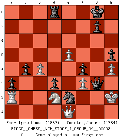 Last move : 0-1 2021 November 15 8:43:38 [Event "FICGS__CHESS__WCH_STAGE_1_GROUP_04__000024"] [Site "FICGS"] [Date "2021.07.11"] [Round "2"] [White "Eser,Ipekyilmaz"] [Black "Swiatek,Janusz"] [Result "0-1"] [WhiteElo "1867"] [BlackElo "1954"] 1.b3 e5 2.e3 d5 3.Bb2 Bd6 4.a3 Nf6 5.a4 a6 6.Na3 Nc6 7.Be2 O-O 8.h3 e4 9.h4 Ne5 10.Nh3 Re8 11.Kf1 c5 12.Kg1 Nc6 13.Qf1 h6 14.Re1 Qe7 15.d3 c4 16.Nb1 cxd3 17.cxd3 exd3 18.Bxd3 Bg4 19.Bc3 Bb4 20.f3 Bxh3 21.Rxh3 d4 22.Bxb4 Qxb4 23.e4 Nd5 24.Bc4 Nf4 25.Rh2 Ne5 26.Rd1 d3 27.Qe1 Qc5+ 28.Qf2 Ne2+ 29.Kf1 Qc7 30.g3 Nxc4 31.bxc4 Nxg3+ 32.Kg2 Ne2 33.Nd2 Rad8 34.Kh1 Ng3+ 35.Kg2 Ne2 36.Kh1 Qd7 37.Rg2 Qxa4 38.Rb1 Qc6 39.Qb6 Qd7 40.Rg4 h5 41.Rg2 Qh3+ 42.Rh2 Ng3+ 43.Kg1 Ne2+ 44.Kh1 Qg3 45.Qe3 a5 46.Qg5 Qc7 47.Rg2 f6 48.Qe3 Re7 49.Ra1 Ng3+ 50.Kg1 Ne2+ 51.Kh1 Ng3+ 52.Kg1 b6 53.Nb3 f5 54.Nd2 Ne2+ 55.Kh1 Ng3+ 56.Kg1 f4 57.Qe1 Re6 58.Qf2 Rc6 59.Qe1 Rg6 60.Kh2 a4 61.Qb1 Qe7 62.Kh3 Qe6+ 63.Kh2 Qf6 64.Kh3 a3 65.Ra2 Ne2 66.Rxg6 Qxg6 67.Qe1 b5 68.Kh2 b4 69.e5 Qg3+ 0-1 This chess game has been lost on time (started : 2021.07.11 16:54:22) Nimzovich-Larsen attack : Modern variation Kingside Castling by player Black (move 7) Player Black won this chess game. Follow this game move after move (download)If your opponent cannot do anything active, then don't rush the position; instead you should let him sit there, suffer, and beg you for a draw. (Jeremy Silman) Meine Liebe ist Schach, Schach, Schach. Ich muss jeden Tag Schach spielen, deshalb fühle ich mich so stark. (Miguel Najdorf) El Ajedrez es el juego mas altamente simbólico, pero las agresiones estan por lo tanto aún mas francamente representadas en la partida. Tal vez comenzo como un juego de guerra; Algo como la representación de una batalla en miniatura entre las fuerzas de dos reinos. (Karl Meninger) Les échecs sont utiles à l'exercice de la faculté de penser et à celle de l'imagination. Car nous devons posséder une méthode élaborée pour atteindre des buts partout où nous devons conduire notre raison. (Leibnitz) It's not enough to succeed. Others must fail. (Gore Vidal)