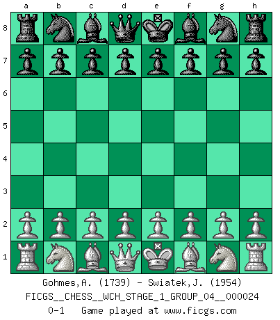 Last move : 0-1 2021 August 11 0:2:41 [Event "FICGS__CHESS__WCH_STAGE_1_GROUP_04__000024"] [Site "FICGS"] [Date "2021.07.11"] [Round "1"] [White "Gohmes,Abdessamed"] [Black "Swiatek,Janusz"] [Result "0-1"] [WhiteElo "1739"] [BlackElo "1954"] 0-1 This chess game has been lost on time (started : 2021.07.11 16:54:22) Player Black won this chess game. Follow this game move after move (download)I'm not afraid of Spassky. The world knows I'm the best. You don't need a match to prove it. (Bobby Fischer) Ohne Fehler kann es keine Brillanz geben. (Emanuel Lasker) Bobby es el jugador de Ajedrez mas fino que este país jamás haya producido. Su memoria para las movidas, su brillantez en soñar combinaciones y su feróz determinación por la victoria son algo extraño. (John Collins) Avant la finale, les dieux ont créé le milieu de partie. (Tarrasch) This is where the fun begins. (Anakin Skywalker in Star Wars ep.3)