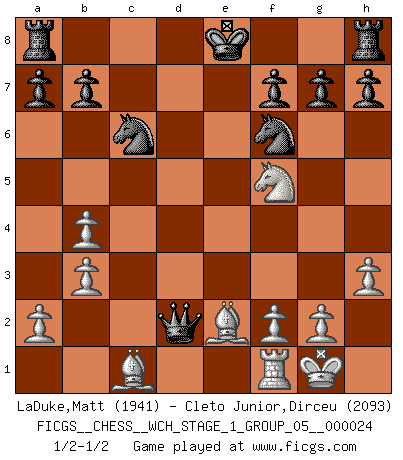 Last move : 1/2-1/2 2021 August 7 17:14:35 [Event "FICGS__CHESS__WCH_STAGE_1_GROUP_05__000024"] [Site "FICGS"] [Date "2021.07.11"] [Round "1"] [White "LaDuke,Matt"] [Black "Cleto Junior,Dirceu"] [Result "1/2-1/2"] [WhiteElo "1941"] [BlackElo "2093"] 1.e4 c5 2.Nc3 d6 3.d4 cxd4 4.Qxd4 Nc6 5.Qd2 e6 6.b3 d5 7.exd5 exd5 8.Nxd5 Nf6 9.Ne3 Qc7 10.Bd3 Qe5 11.c3 Bg4 12.h3 Bh5 13.Ne2 Bxe2 14.Bxe2 Bb4 15.cxb4 Qxa1 16.O-O Qd4 17.Nf5 Qxd2 1/2-1/2 Sicilian : Closed Kingside Castling by player White (move 16) This chess game ended in a draw. Follow this game move after move (download)Examine moves that smite! A good eye for smites is far more important than a knowledge of strategical principles. (Purdy) Warum muß ich gegen diesen IDIOTEN verlieren? (Aaron Nimzowitsch) El Ajedrez te enseña a controlarl la excitación inicial que sientes cuando vez algo que parece bueno y te enseña a pensar objetivamente cuando te encuentras en problemas. (Stanley Kubrick) Les échecs, c'est l'art d'analyser. (Mikhail Botvinnik) Every man's memory is his private literature. (Aldous Huxley)