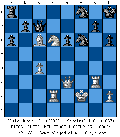 Last move : 1/2-1/2 2021 July 14 14:28:36 [Event "FICGS__CHESS__WCH_STAGE_1_GROUP_05__000024"] [Site "FICGS"] [Date "2021.07.11"] [Round "1"] [White "Cleto Junior,Dirceu"] [Black "Sorcinelli,Andrea"] [Result "1/2-1/2"] [WhiteElo "2093"] [BlackElo "1867"] 1.e4 c5 2.Nf3 d6 3.d4 cxd4 4.Nxd4 Nf6 5.Nc3 a6 6.Bg5 e6 7.f4 Qb6 8.Qd2 Qxb2 9.Rb1 Qa3 10.e5 dxe5 11.fxe5 Nfd7 12.Ne4 h6 13.Bh4 Qxa2 14.Rd1 Qd5 15.Qe3 Qxe5 16.Be2 Bc5 17.Bg3 Qd5 18.c4 Bxd4 19.Rxd4 Qa5+ 20.Rd2 O-O 21.Bd6 f5 22.Bxf8 Nxf8 23.Nd6 Nbd7 24.Bf3 Qa1+ 25.Rd1 Qa5+ 26.Kf2 Qc7 27.g4 fxg4 28.Bxg4 Nf6 29.Rhg1 Bd7 30.Bf3 Ba4 31.Rd2 Kh8 32.Rg3 Bc6 33.Bxc6 1/2-1/2 Sicilian : Najdorf, 7...Qb6 Kingside Castling by player Black (move 20) This chess game ended in a draw. Follow this game move after move (download)The only thing Chess players have in common is Chess. (Lodewijk Prins) Es ist nicht das erste mal, dass sich die FIDE dem Arabischen Geld gebeugt hat (über die FIDE WM 2004 in Lybien). (Larry Evans) No es tiempo de jugar al Ajedrez cuando la casa esta en llamas. (Proverbio Italiano) Les Echecs ne sont pas pour les âmes timides. Ils requièrent un homme entier, qui ne s'arrête pas aveuglément à ce qui a été déjà établi, mais qui tente individuellement de sonder les profondeurs du jeu. (W. Steinitz) Those who make the worst use of their time are the first to complain of its brevity. (Jean de la Bruyere)