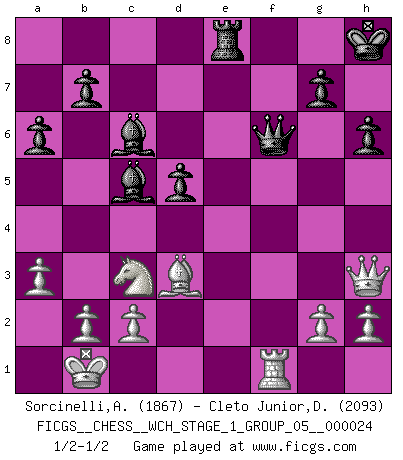 Last move : 1/2-1/2 2021 July 15 14:14:42 [Event "FICGS__CHESS__WCH_STAGE_1_GROUP_05__000024"] [Site "FICGS"] [Date "2021.07.11"] [Round "2"] [White "Sorcinelli,Andrea"] [Black "Cleto Junior,Dirceu"] [Result "1/2-1/2"] [WhiteElo "1867"] [BlackElo "2093"] 1.e4 c5 2.Nf3 d6 3.d4 cxd4 4.Nxd4 Nf6 5.Nc3 Nc6 6.Bg5 e6 7.Qd2 a6 8.O-O-O Bd7 9.Kb1 Be7 10.Nxc6 Bxc6 11.f3 h6 12.Be3 d5 13.e5 Nd7 14.f4 Qa5 15.Qf2 O-O 16.Bd3 Rac8 17.Qg3 Qc7 18.Rhe1 Rfe8 19.a3 Bf8 20.Qh3 Nc5 21.Bxc5 Bxc5 22.f5 exf5 23.Bxf5 Rcd8 24.e6 Kh8 25.exf7 Qxf7 26.Bd3 Qf6 27.Rxe8+ Rxe8 28.Rf1 1/2-1/2 Sicilian : Richter-Rauzer, Rauzer attack, 7...a6 Queenside Castling by player White (move 8) Kingside Castling by player Black (move 15) This chess game ended in a draw. Follow this game move after move (download)The way he plays Chess demonstrates a man's whole nature. (Stanley Ellin) Offener Brief an US-Präsident Bush anlässlich der Verhaftung Bobby Fishers: Verhaften Sie mich. Stecken Sie mich in dieselbe Zelle wie Bobby Fisher und geben Sie uns ein Schachspiel mit. (Boris Vassilievich Spassky) Yo adoro todas la posiciones. Denme una partida posicional difícil, y la jugaré. Pero posiciones totalmente ganadas, no las tolero. (Hein Donner) Vous savez, camarade Pachman, je n'éprouve pas de plaisir à être ministre, je jouerais plutôt aux échecs comme vous, ou alors ferais une révolution au Venezuela. (Che Guevara à Ludek Pachman, 'Checkmate in Prague', 1975) That's absurd. I love it. (Gregory House, House M.D.)