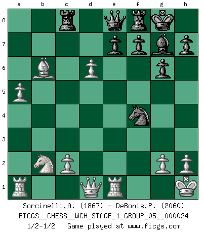 Last move : 1/2-1/2 2021 August 25 3:52:44 [Event "FICGS__CHESS__WCH_STAGE_1_GROUP_05__000024"] [Site "FICGS"] [Date "2021.07.11"] [Round "1"] [White "Sorcinelli,Andrea"] [Black "DeBonis,Patrick"] [Result "1/2-1/2"] [WhiteElo "1867"] [BlackElo "2060"] 1.e4 c5 2.Nf3 d6 3.d4 cxd4 4.Nxd4 Nf6 5.Nc3 g6 6.Be3 Bg7 7.Be2 Nc6 8.O-O O-O 9.Nb3 Be6 10.f4 Rc8 11.Kh1 Na5 12.e5 Ne8 13.Bxa7 Nc4 14.Bxc4 Bxc4 15.Re1 b6 16.Na4 b5 17.Nc3 Nc7 18.a4 b4 19.Na5 bxc3 20.Nxc4 cxb2 21.Nxb2 Ne6 22.a5 Nxf4 23.Bb6 Qe8 24.exd6 1/2-1/2 Sicilian : Dragon, Classical attack Kingside Castling by player White (move 8) Kingside Castling by player Black (move 8) This chess game ended in a draw. Follow this game move after move (download)The passed Pawn is a criminal, who should be kept under lock and key. Mild measures, such as police surveillance, are not sufficient. (Aaron Nimzovich) Wie kann ich Remis annehmen? Ich weiß ja gar nicht, wie ich stehe! (Fritz Sämisch) Cuando veas una buena jugada, trata de encontrar otra mejor. (Emanuel Lasker) Le jeu d'échecs est comme rejeté hors du temps. (Antoine de Saint-Exupéry) Happy endings are just stories that haven't finished yet. (Jane Smith in Mr & Mrs Smith)