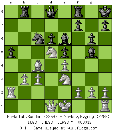 Last move : 0-1 2007 November 28 7:53:35 [Event "FICGS__CHESS__CLASS_M__000012"] [Site "FICGS"] [Date "2007.07.14"] [Round "1"] [White "Porkolab,Sandor"] [Black "Yarkov,Evgeny"] [Result "0-1"] [WhiteElo "2269"] [BlackElo "2255"] 1.e4 c5 2.Nf3 Nc6 3.d4 cxd4 4.Nxd4 Nf6 5.Nc3 e5 6.Ndb5 d6 7.Bg5 a6 8.Na3 b5 9.Nd5 Be7 10.Bxf6 Bxf6 11.c3 Bg5 12.Nc2 O-O 13.a4 bxa4 14.Rxa4 a5 15.Bc4 Rb8 16.b3 Kh8 17.Nce3 g6 18.Ra2 Be6 0-1 This chess game has been lost on time (started : 2007.07.14 6:12:16) Sicilian : Pelikan (Lasker/Sveshnikov) variation Kingside Castling by player Black (move 12) Player Black won this chess game. Follow this game move after move (download)In life, as in Chess, one's own Pawns block one's way. A man's very wealth, ease, leisure, children, books, which should help him to win, more often checkmate him. (Charles Buxton) Ich würde mich als ganz normalen Jungen bezeichnen [Im Alter von 12]. (Sergej Karjakin) Para mi, el Ajedrez es la vida y cada partida es como una nueva vida. Todo jugador de Ajedrez suele vivir muchas vidas durante su vida. (Eduard Gufeld) J'apprécie les joueurs d'est-indienne, c'est grâce à eux que je nourris ma famille depuis tant d'années. (Petrosian) Men never do evil so completely and cheerfully as when they do it from religious conviction. (Blaise Pascal)