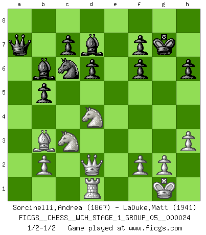 Last move : 1/2-1/2 2021 August 24 5:24:59 [Event "FICGS__CHESS__WCH_STAGE_1_GROUP_05__000024"] [Site "FICGS"] [Date "2021.07.11"] [Round "2"] [White "Sorcinelli,Andrea"] [Black "LaDuke,Matt"] [Result "1/2-1/2"] [WhiteElo "1867"] [BlackElo "1941"] 1.e4 e5 2.Nf3 Nc6 3.Bb5 a6 4.Ba4 Nf6 5.O-O Bc5 6.c3 b5 7.Bb3 d6 8.h3 O-O 9.Re1 Bb6 10.d4 Re8 11.Bg5 h6 12.Bh4 Bd7 13.a4 exd4 14.axb5 axb5 15.Rxa8 Qxa8 16.Bxf6 gxf6 17.Qd2 Kg7 18.cxd4 Qa7 19.Rd1 Rxe4 20.Nc3 Rxd4 21.Nxd4 1/2-1/2 Ruy Lopez : Moeller defense Kingside Castling by player White (move 5) Kingside Castling by player Black (move 8) This chess game ended in a draw. Follow this game move after move (download)Chess, like any creative activity, can exist only through the combined efforts of those who have creative talent, and those who have the ability to organize their creative work. (Mikhail Botvinnik) Frage des Reporters: -Worin besteht das Ziel von Gambiteröffnungen? Antwort: -Auf Kosten der Partie einen Ruf als Angriffspieler zu erwerben.- (Siegbert Tarrasch) Los errores estan ahí, esperando a que se cometan. (Savielly Tartakower) Pour se monter efficace, un Cavalier a besoin d'avant-postes ! Les Cavaliers font les meilleurs bloqueurs de pions passés. The next best thing to gambling and winning is gambling and loosing. (Nick Dandalos)