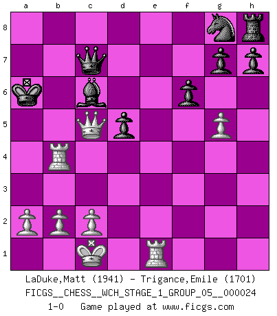 Last move : 1-0 2021 September 23 19:3:9 [Event "FICGS__CHESS__WCH_STAGE_1_GROUP_05__000024"] [Site "FICGS"] [Date "2021.07.11"] [Round "2"] [White "LaDuke,Matt"] [Black "Trigance,Emile"] [Result "1-0"] [WhiteElo "1941"] [BlackElo "1701"] 1.e4 c5 2.Nc3 Nc6 3.Nf3 e6 4.d4 cxd4 5.Nxd4 d6 6.Be3 Bd7 7.g4 Be7 8.h4 Bxh4 9.Nd5 exd5 10.Be2 dxe4 11.Qd2 Bf6 12.Nb5 Be5 13.O-O-O Qe7 14.Nc7+ Kd8 15.Nxa8 Kc8 16.f3 exf3 17.Bxf3 Kb8 18.Bxc6 Bxc6 19.Qa5 b6 20.Nxb6 axb6 21.Qxb6+ Bb7 22.g5 Qc7 23.Qa7+ Kc8 24.Rhf1 f6 25.Bf4 Bxf4+ 26.Rxf4 d5 27.Qe3 Qe7 28.Qf2 Bc6 29.Re1 Qd7 30.Qc5 Qc7 31.Qf8+ Kb7 32.Rb4+ Ka6 33.Qc5 1-0 Sicilian : Closed, 2...Nc6 Queenside Castling by player White (move 13) Player White won this chess game. Follow this game move after move (download)Via the squares on the chessboard, the Indians explain the movement of time and the age, the higher influences which control the world and the ties which link Chess with the human soul. (Al-Masudi) Ein Großmeister muß tausende Partien in seinem Kopf speichern, denn diese sind für Ihn, was die Worte der Muttersprache für gewöhnliche Leute sind, oder Noten für Musiker... (Garry Kasparov) El Ajedrez moderno está demasiado preocupado con cosas como la estructura de Peones. Olvidenlo, el Jaque Mate termina la partida. (Nigel Short) Seul un grand joueur sait à quel point il joue faiblement. (Xavier Tartacover) If you don't practice you don't deserve to win. (Andre Agassi)