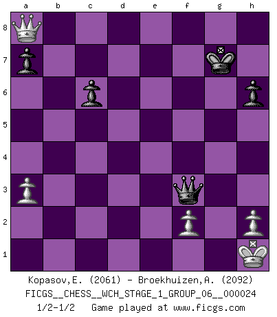 Last move : 1/2-1/2 2021 September 19 23:26:6 [Event "FICGS__CHESS__WCH_STAGE_1_GROUP_06__000024"] [Site "FICGS"] [Date "2021.07.11"] [Round "2"] [White "Kopasov,Evgeny"] [Black "Broekhuizen,A. T. S."] [Result "1/2-1/2"] [WhiteElo "2061"] [BlackElo "2092"] 1.d4 Nf6 2.c4 e6 3.Nf3 d5 4.Nc3 Bb4 5.Qa4+ Nc6 6.a3 Bxc3+ 7.bxc3 h6 8.cxd5 exd5 9.c4 O-O 10.e3 Bg4 11.Be2 Re8 12.Bb2 Ne7 13.cxd5 Ng6 14.O-O Bxf3 15.Bxf3 Nh4 16.Kh1 Nxf3 17.gxf3 Qxd5 18.Qd1 c6 19.Rg1 Qe6 20.Qc2 Nh5 21.Rg4 f5 22.d5 Qxd5 23.e4 Qf7 24.exf5 Re7 25.Rag1 Qd5 26.Qc3 Qxf5 27.Qb3+ Kh7 28.Bxg7 Rxg7 29.Rxg7+ Nxg7 30.Rxg7+ Kxg7 31.Qxb7+ Qf7 32.Qxa8 Qxf3+ 1/2-1/2 Queen's pawn game Kingside Castling by player Black (move 9) Kingside Castling by player White (move 14) 10 pieces endgame at move 32 : White KQPPP , Black KQPPP WHITE : King + 1 Queen 3 Pawns BLACK : King + 1 Queen 3 Pawns This chess game ended in a draw. Follow this game move after move (download)Chess books should be used as we use glasses: to assist the sight, although some players make use of them as if they thought they conferred sight. (Jose Raul Capablanca) Schach ist wie eine schöne Frau, zu der wir ständig zurückkehren, gleichviel, wie oft sie uns zurückweist. (Anonymous) Aquel que teme a un Peón de Reina aislado, debería de retirarse del Ajedrez. (Siegbert Tarrasch) 'L'échange des dames est un coup dur pour les deux adversaires...' Un journaliste lors d'une partie du match Spassky-Fischer Now you put water in a cup, it becomes the cup; You put water into a bottle it becomes the bottle; You put it in a teapot it becomes the teapot. Water can flow or it can crash. Be water, my friend. (Bruce Lee)