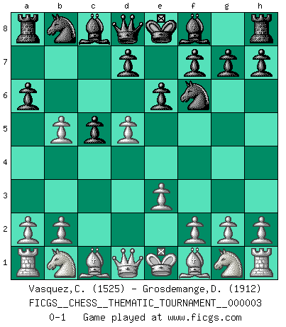 Last move : 0-1 2006 September 5 17:34:11 [Event "FICGS__CHESS__THEMATIC_TOURNAMENT__000003"] [Site "FICGS"] [Date "2006.06.24"] [Round "1"] [White "Vasquez,Carlos"] [Black "Grosdemange,David"] [Result "0-1"] [WhiteElo "1525"] [BlackElo "1912"] 1.d4 Nf6 2.c4 c5 3.d5 b5 4.cxb5 a6 5.e3 e6 0-1 This chess game has been lost on time (started : 2006.06.24 13:30:12) Benko gambit half accepted Player Black won this chess game. Follow this game move after move (download)Pawns: they are the soul of this game, they alone form the attack and defense. (Philidor) Es liegt in der Natur, vernüftig zu denken und unlogisch zu handeln. (Anatole France) No hay precio que no valga la pena por la cabellera del Rey enemigo. (Koblentz) Dieu déplace le joueur, et celui-ci la pièce. Quel Dieu derrière Dieu commence donc la trame ? Arturo Perez-Reverte (prix de littérature policière 1993). Faith : not wanting to know what is true. (Friedrich Nietzsche)