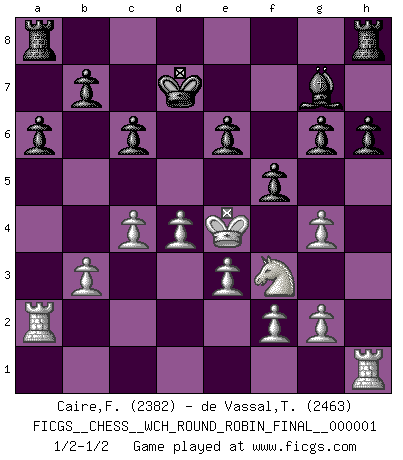 Last move : 1/2-1/2 2007 September 7 14:9:11 [Event "FICGS__CHESS__WCH_ROUND_ROBIN_FINAL__000001"] [Site "FICGS"] [Date "2007.07.14"] [Round "1"] [White "Caire,Francois"] [Black "de Vassal,Thibault"] [Result "1/2-1/2"] [WhiteElo "2382"] [BlackElo "2463"] 1.d4 d5 2.Nf3 Nf6 3.c4 c6 4.Qc2 g6 5.Bf4 Na6 6.e3 Bf5 7.Qb3 Qb6 8.Nc3 Nh5 9.Bg3 Qxb3 10.axb3 Nxg3 11.hxg3 Nb4 12.Kd2 dxc4 13.bxc4 Bg7 14.Na2 Nxa2 15.Rxa2 a6 16.Bd3 Bxd3 17.Kxd3 h6 18.g4 Kd7 19.b3 e6 20.Ke4 f5+ 1/2-1/2 Comment by player 2 : Thibault de Vassal : Salut François. Merci pour la partie et bonne chance dans le tournoi ! Queen's pawn game This chess game ended in a draw. Follow this game move after move (download)Suddenly it was obvious to me in my analysis I had missed what Fischer had found with the greatest of ease at the board. (Mikhail Botvinnik) Intelligenz läßt sich nicht am Weg, sondern nur am Ergebnis feststellen. (Garry Kasparov) La maestrÃa del Ajedrez consiste esencialmente en analizar posiciónes de Ajedrez con precisión. (Mikhail Botvinnik) Les pièces de l'échiquier étaient impitoyables. Elles le retenaient, elles l'absorbaient. Il y avait de l'horreur en cela, mais aussi une harmonie unique. Car, qu'y a-t-il dans le monde, à part les échecs ? (V. Nabokov) Life is the sum of all your choices. (Albert Camus)