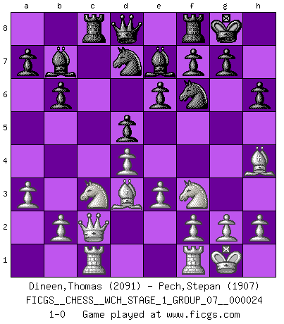 Last move : 1-0 2021 August 26 5:46:21 [Event "FICGS__CHESS__WCH_STAGE_1_GROUP_07__000024"] [Site "FICGS"] [Date "2021.07.11"] [Round "2"] [White "Dineen,Thomas"] [Black "Pech,Stepan"] [Result "1-0"] [WhiteElo "2091"] [BlackElo "1907"] 1.d4 Nf6 2.c4 e6 3.Nf3 d5 4.Nc3 c6 5.Bg5 h6 6.Bh4 Be7 7.e3 Nbd7 8.Qc2 O-O 9.a3 b6 10.cxd5 cxd5 11.Bd3 Bb7 12.O-O Rc8 13.Rac1 1-0 Queen's pawn game Kingside Castling by player Black (move 8) Kingside Castling by player White (move 12) Player White won this chess game. Follow this game move after move (download)One of these modest little moves may be more embarrassing to your opponent than the biggest threat. (Siegbert Tarrasch) Modernes Schach erfordert enorme Anspannung. Es ist für einen normalen Menschen unmöglich das auszuhalten. (Viktor Kortschnoi) Con el tiempo, empecé a progresar en partidas decisivas. Tal vez porque me di cuenta de una simple verdad: no solo estaba yo nervioso sino también mi oponente. (Mikhail Tal) Je crois qu'il existe des manières très spécifiques de jouer efficacement contre une machine. Evidemment, nous n'avons aucune chance en technique pure, parce que l'ordinateur calcule de manière parfaite. Mais lorsque nous faisons appel à notre cerveau, en utilisant l'intuition et la compréhension, alors nous restons beaucoup plus forts. (Anatoli Karpov) Inventor: A person who makes an ingenious arrangement of wheels, levers and springs, and believes it civilization. (Ambrose Bierce, The Devil's Dictionary)