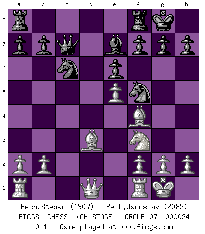 Last move : 0-1 2021 October 7 4:26:3 [Event "FICGS__CHESS__WCH_STAGE_1_GROUP_07__000024"] [Site "FICGS"] [Date "2021.07.11"] [Round "2"] [White "Pech,Stepan"] [Black "Pech,Jaroslav"] [Result "0-1"] [WhiteElo "1907"] [BlackElo "2082"] 1.e4 c6 2.d4 d5 3.e5 Bf5 4.Nf3 e6 5.Be2 c5 6.Be3 cxd4 7.Nxd4 Ne7 8.Nd2 Nbc6 9.N2f3 Bg4 10.O-O Bxf3 11.Nxf3 Qc7 12.c4 dxc4 13.Bxc4 Nf5 14.Bf4 Be7 15.Bd3 O-O 0-1 Caro-Kann : Advance variation Kingside Castling by player White (move 10) Kingside Castling by player Black (move 15) Player Black won this chess game. Follow this game move after move (download)Chess is imagination. (David Bronstein) Sicherlich können nur Meister einen Stil haben. Daß ein nicht-Meister auch nur ein einziges Mal in seinem Leben eine Partie folgerecht durchführte, habe ich niemals bemerkt. (Emanuel Lasker) De todos mis libros Rusos, la defensa contiene y difunde el 'calor' mas grande que pudiese verse extraño al observar lo supremamente abstracto que el Ajedrez supuestamente es. (Vladimir Nabokov) Roi des jeux et jeu des rois, les échecs portent en eux un sentiment d'infini. Ils donnent à celui qui s'est efforcé d'en approfondir les arcanes l'impression de n'être pas à la mesure de l'homme; en fait, ils constituent un résumé de l'univers, un microcosme, et figurent cette grande échelle qui, dans les plans de la lumière descend jusqu'à la matière, qui des abîmes insondables remonte jusqu'en l'infini de Dieu. (Pyrame) It is a good thing for an uneducated man to read books of quotations. (Winston Churchill)